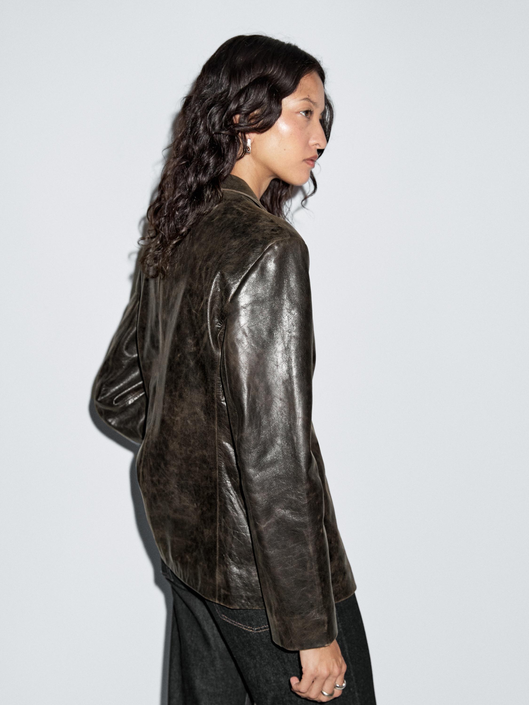 Блейзер из кожи наппа с потертостями Massimo Dutti, коричневый