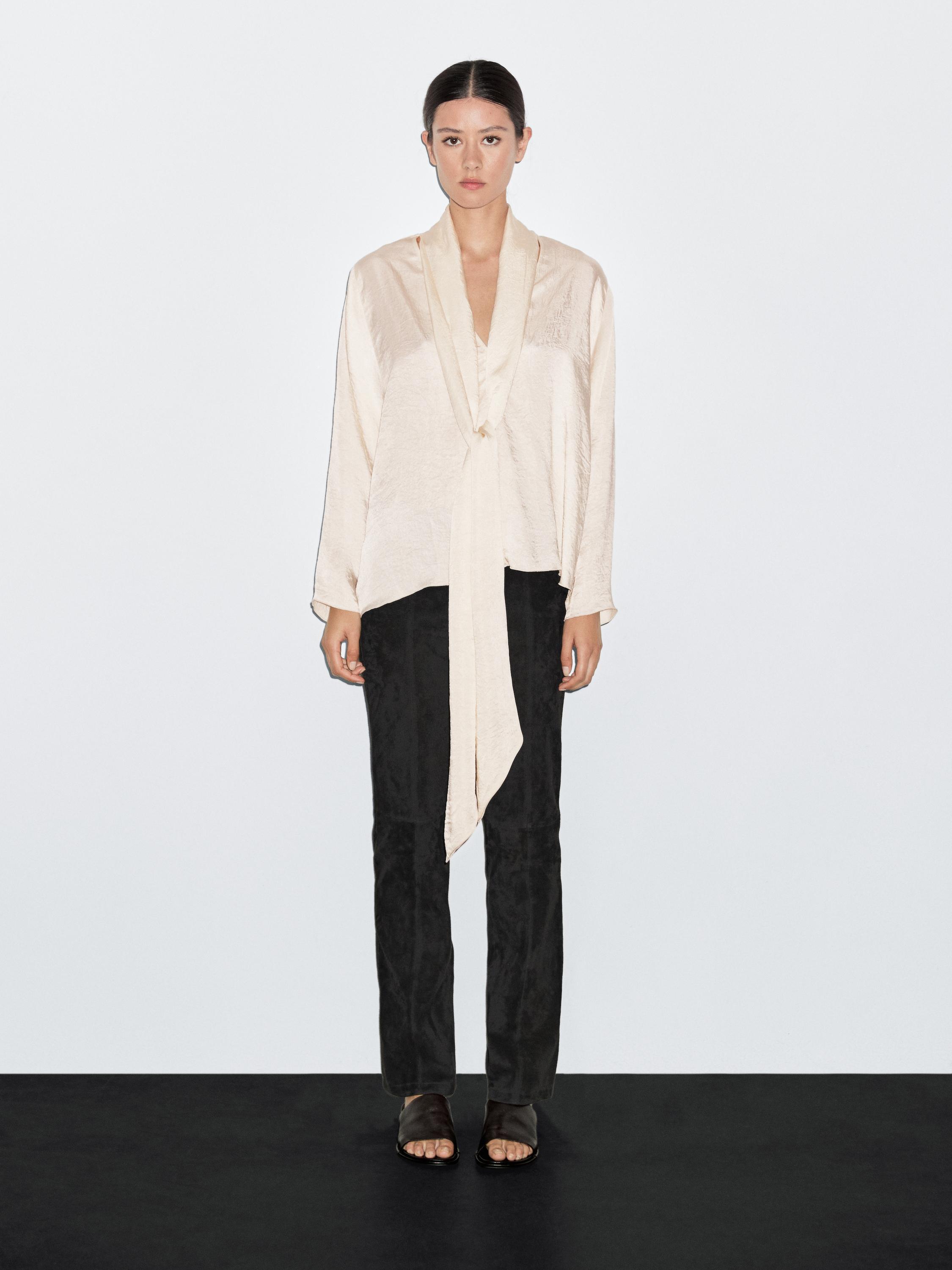 Струящаяся блузка из атласной ткани. V-образный вырез. Длинные рукава. Завязывается на шее.