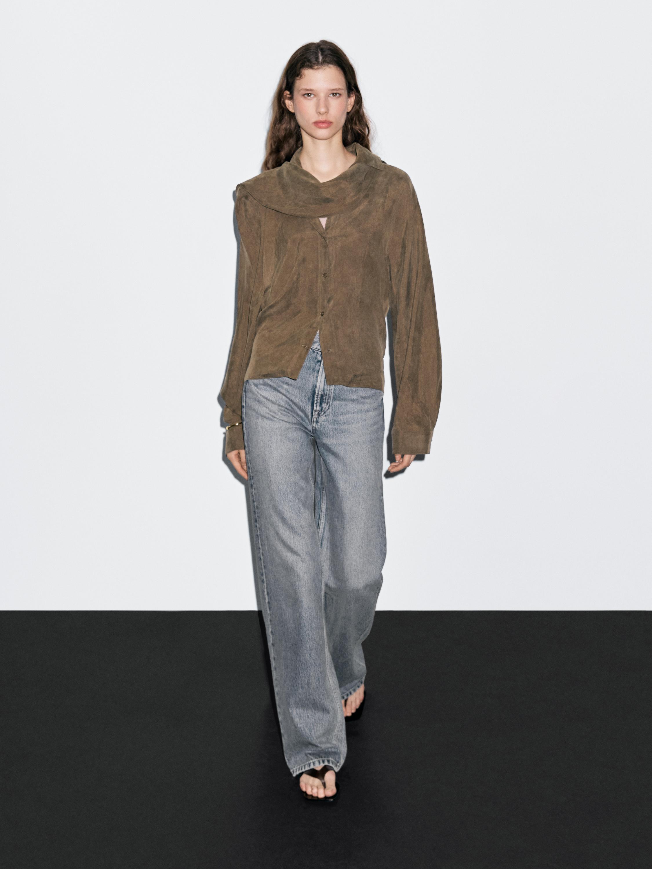 Рубашка с завязкой на шее. Длинные рукава с манжетами на пуговицах. V-образный вырез. Застежка на пуговицы спереди. Мягкая, приятная на ощупь ткань. Свободный и свободный силуэт, не приталенный.