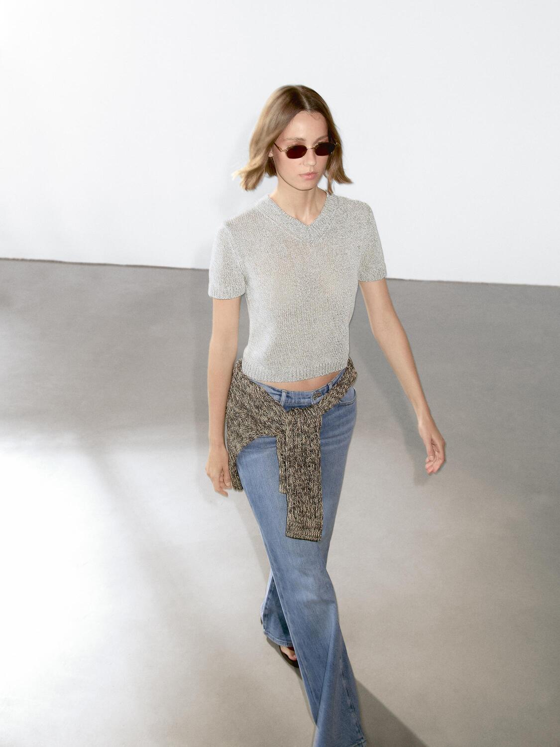 Вязаный свитер из смесовой хлопковой ткани. V-образный вырез. Короткие рукава. Изготовлен из смесовой хлопковой ткани.