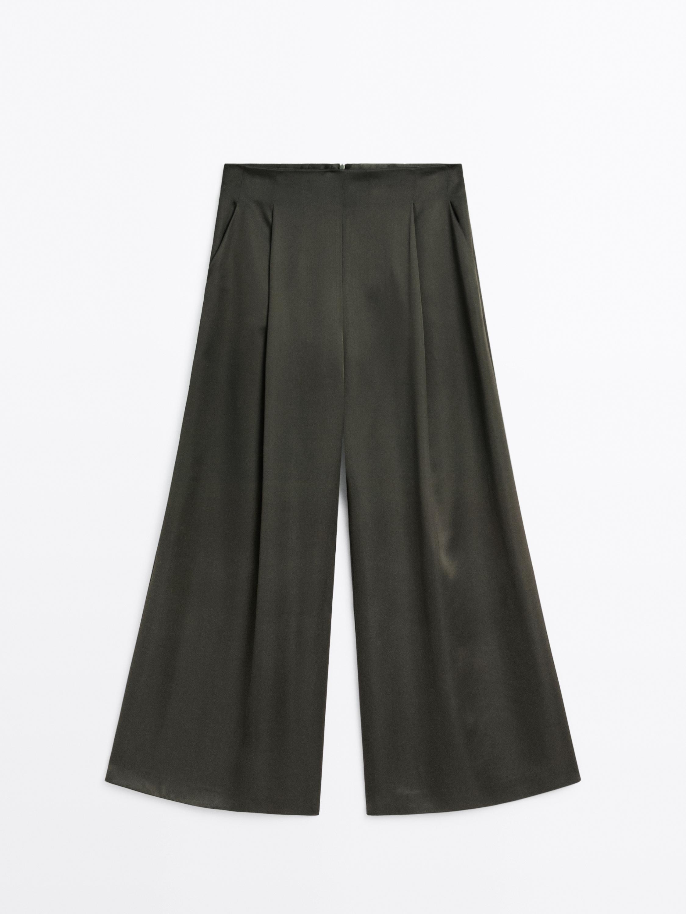 Широкие брюки из атласной ткани. Потайная молния сзади. Два боковых кармана. Два прорезных кармана сзади. Вытачки спереди.