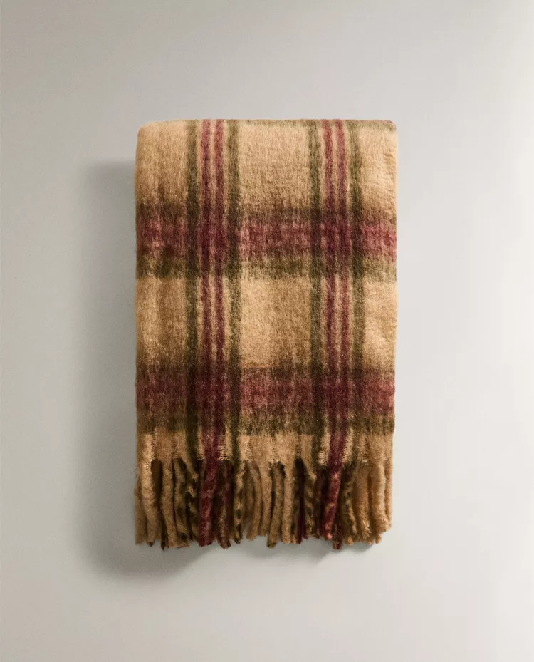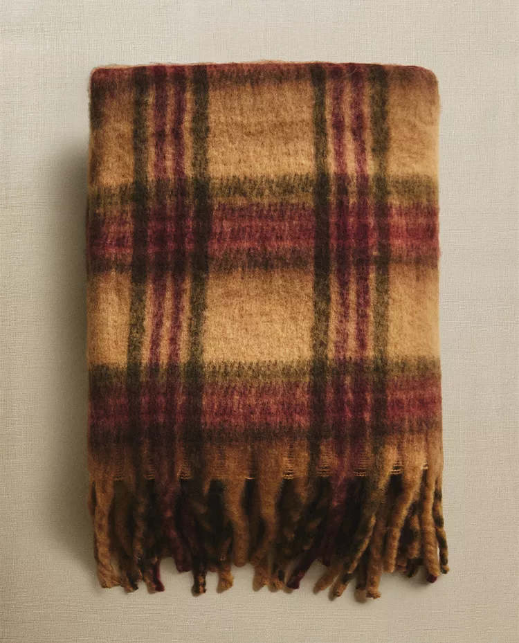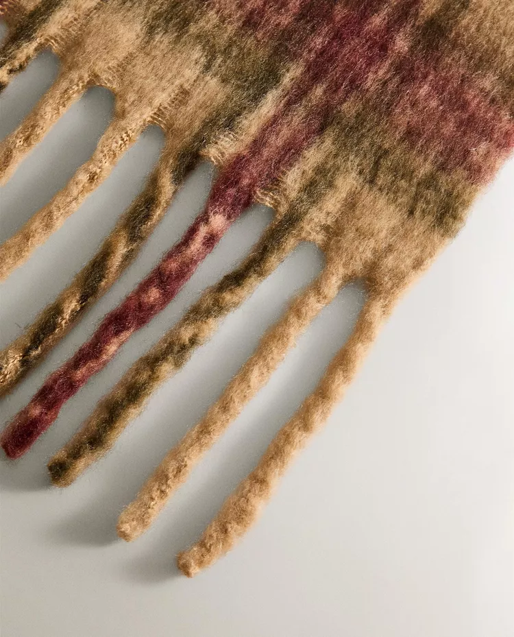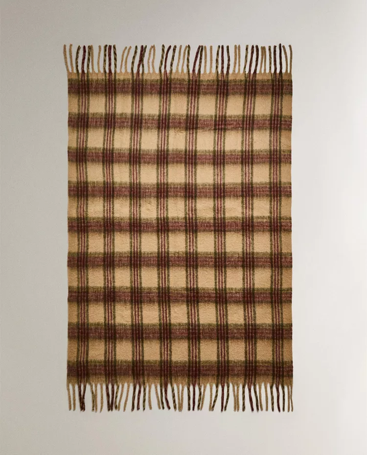 Лёгкий плед с мягкой текстурой и бахромой по краям. Доступен в разных цветах с клетчатым рисунком.