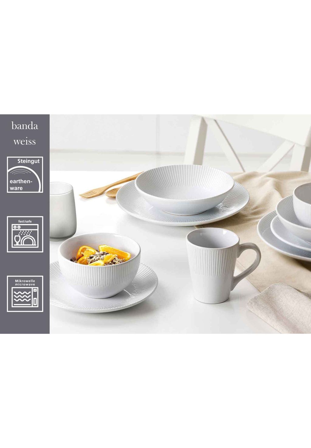 Повседневная посуда, которую можно комбинировать: banda непринужденно сопровождает нас во время еды. Благодаря своей простой и функциональной форме купе, несколько избранных предметов посуды не только универсальны, но и имеют решительный современный вид с минималистской эстетикой. Слегка изогнутые тарелки без бортиков предлагают много места для еды. Будь то простая или гармонично сочетающаяся с современными цветовыми вариациями, banda гарантирует современную, непринужденную атмосферу за столом — не в последнюю очередь благодаря своему очаровательному полосатому рельефу.