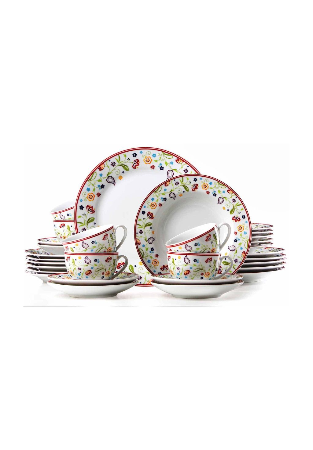 Комплект поставки: 6 тарелок для торта, 6 кофейных чашек, 6 кофейных блюдец, 6 обеденных тарелок, 6 суповых тарелок