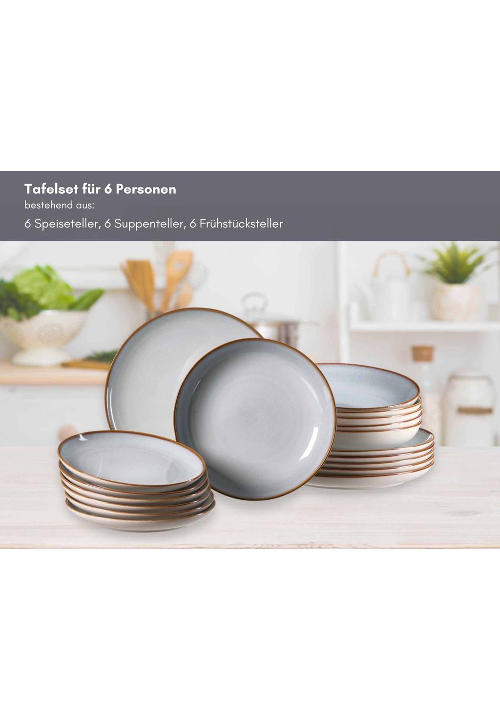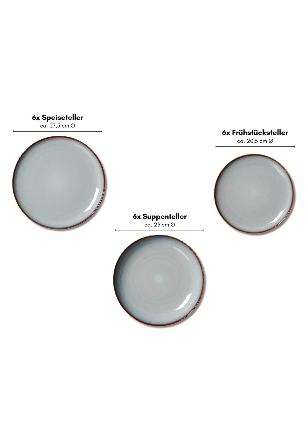 Универсальный набор из 18 предметов: содержит 6 обеденных тарелок (ø 27,5 см), 6 суповых тарелок (ø 23 см) и 6 десертных тарелок (ø 20,5 см) - идеально подходит для 6 человек.