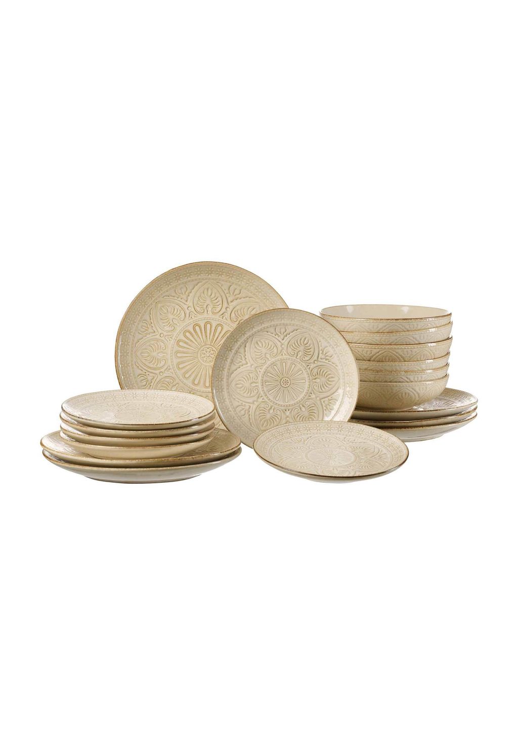 Особенности: Восточный дизайн — Набор тарелок Omara из 18 предметов впечатляет художественным рельефным орнаментом и стильными песочными тонами, создавая благородную атмосферу.