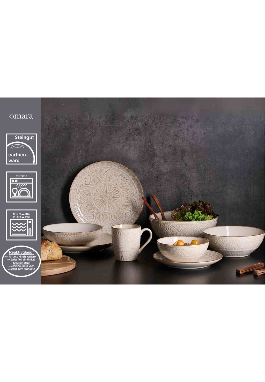 Как будто сошёл со страниц сказок «Тысяча и одна ночь»: благодаря великолепному рельефному орнаменту, Omara привносит в интерьер восточный колорит. В отличие от традиционных красочных узоров Востока, посуда выполнена в простых песочных тонах с очаровательным эффектом состаривания. Этот особый вид достигается с помощью реактивной глазури, которая создаёт индивидуальные цветовые переходы и текстуры во время обжига. Поэтому, как и в случае с традиционными изделиями ручной работы, каждый предмет посуды уникален. Будь то сервировка традиционных восточных блюд или простых повседневных трапез, эта изысканная посуда позволит вам погрузиться в увлекательный мир Аладдина, Шехерезады, Али-Бабы и других. Co. погрузитесь в атмосферу.