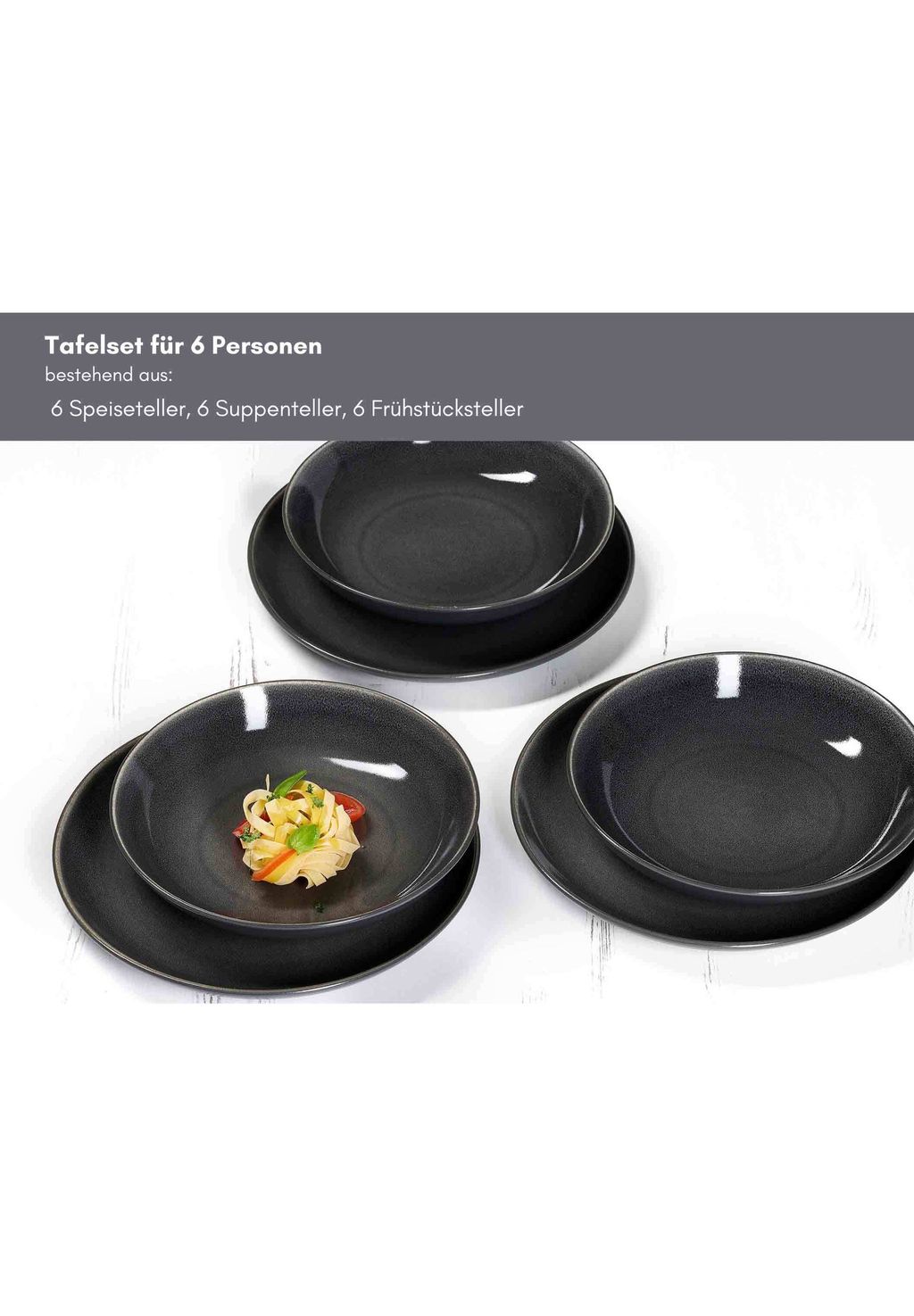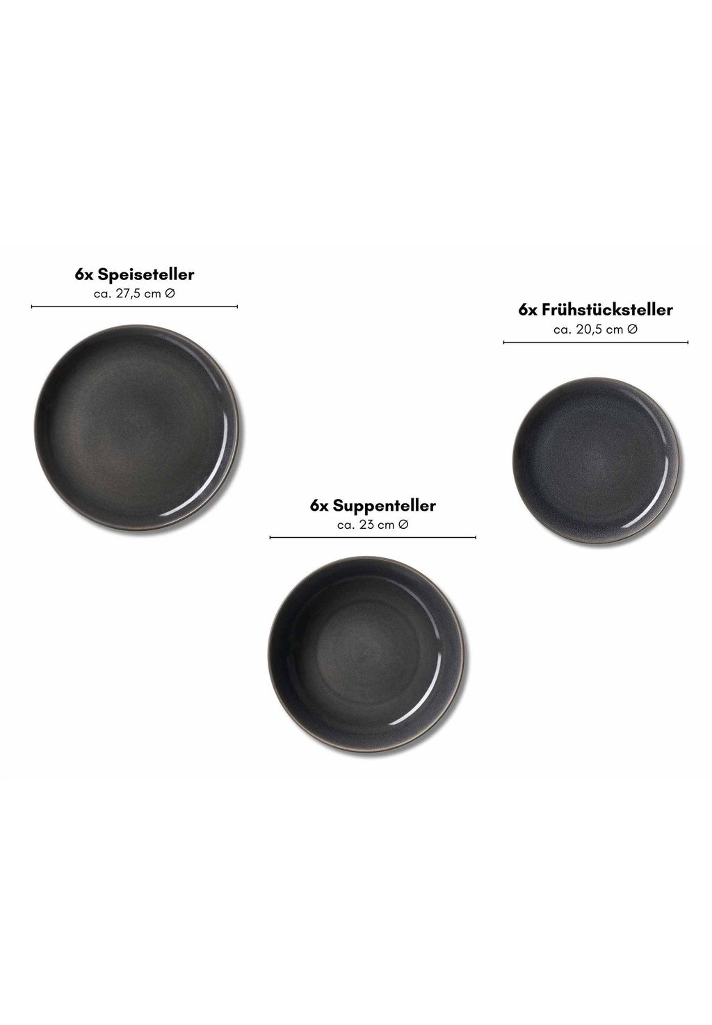 Обширный набор: Идеально подходит для 6 человек — содержит 6 обеденных тарелок (ø 27,5 см), 6 суповых тарелок (ø 23 см) и 6 десертных тарелок (ø 20,5 см).