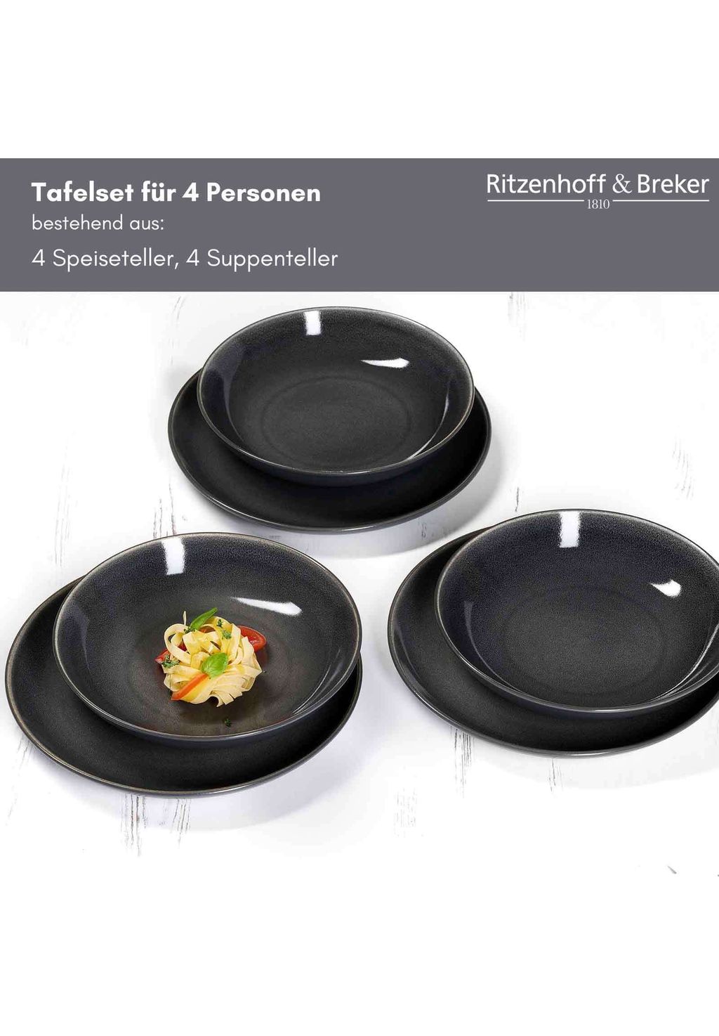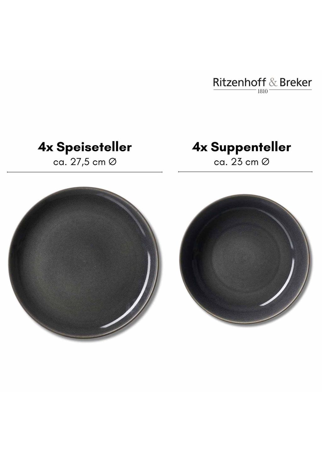 Универсальный набор: Набор из 8 предметов включает 4 обеденные тарелки (ø 27,5 см) и 4 суповые тарелки (ø 23 см) и идеально подходит для стильных домашних обедов.