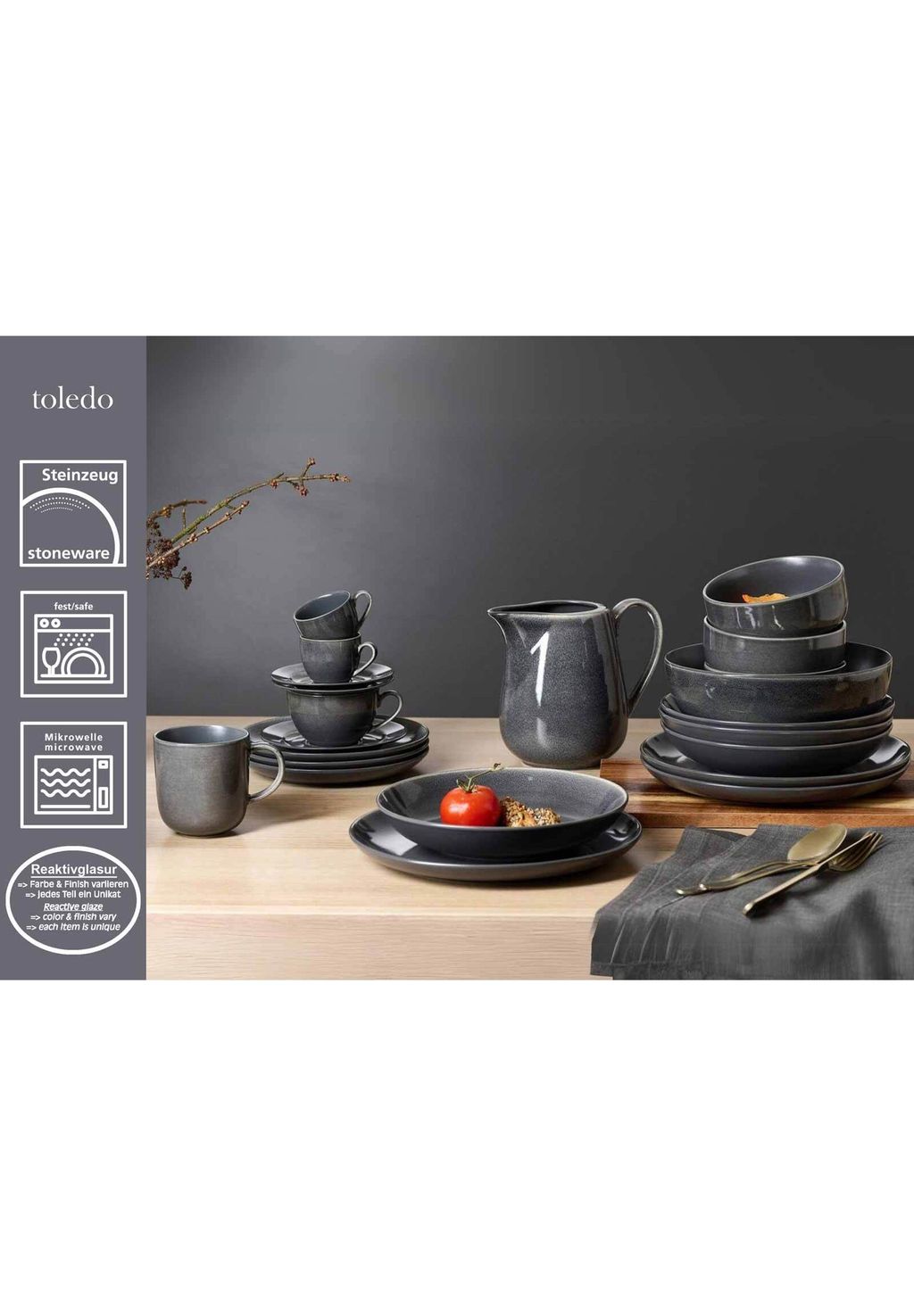 Обеденный гарнитур Toledo впечатляет минималистской, функциональной формой купе и изысканным сочетанием двух различных фактур: нижние стороны предметов столовой посуды графитово-серого цвета облагорожены матовой отделкой мелового оттенка, а верхние стороны покрыты так называемой реактивной глазурью, которая создает индивидуальные цветовые градиенты и структуры в процессе обжига, так что - как и в случае традиционного мастерства - не существует двух абсолютно одинаковых предметов столовой посуды. Благодаря своей яркой, деревенской эстетике Toledo не только идеально вписывается в строгий индустриальный стиль жизни, но и может чудесно добавить яркий акцент в светлые, мягкие скандинавские интерьеры.