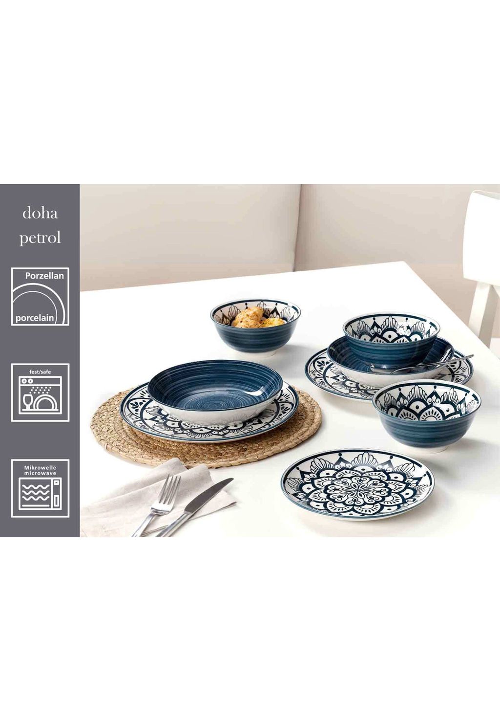 Великолепие: Столовый сервиз Doha отдаёт дань уважения одноименной столице Катара, перспективному мегаполису, где традиции и инновации завораживают. Благодаря арабескам, цветочному орнаменту, вдохновлённому великолепием исторических зданий Дохи, и простому дизайну, отражающему ультрасовременную архитектуру современных зданий, Doha привносит в сервировку стола этот уникальный шарм. Благодаря своему восточному очарованию эта посуда особенно подходит для экзотических блюд, таких как марокканский тажин и другие кулинарные изыски.