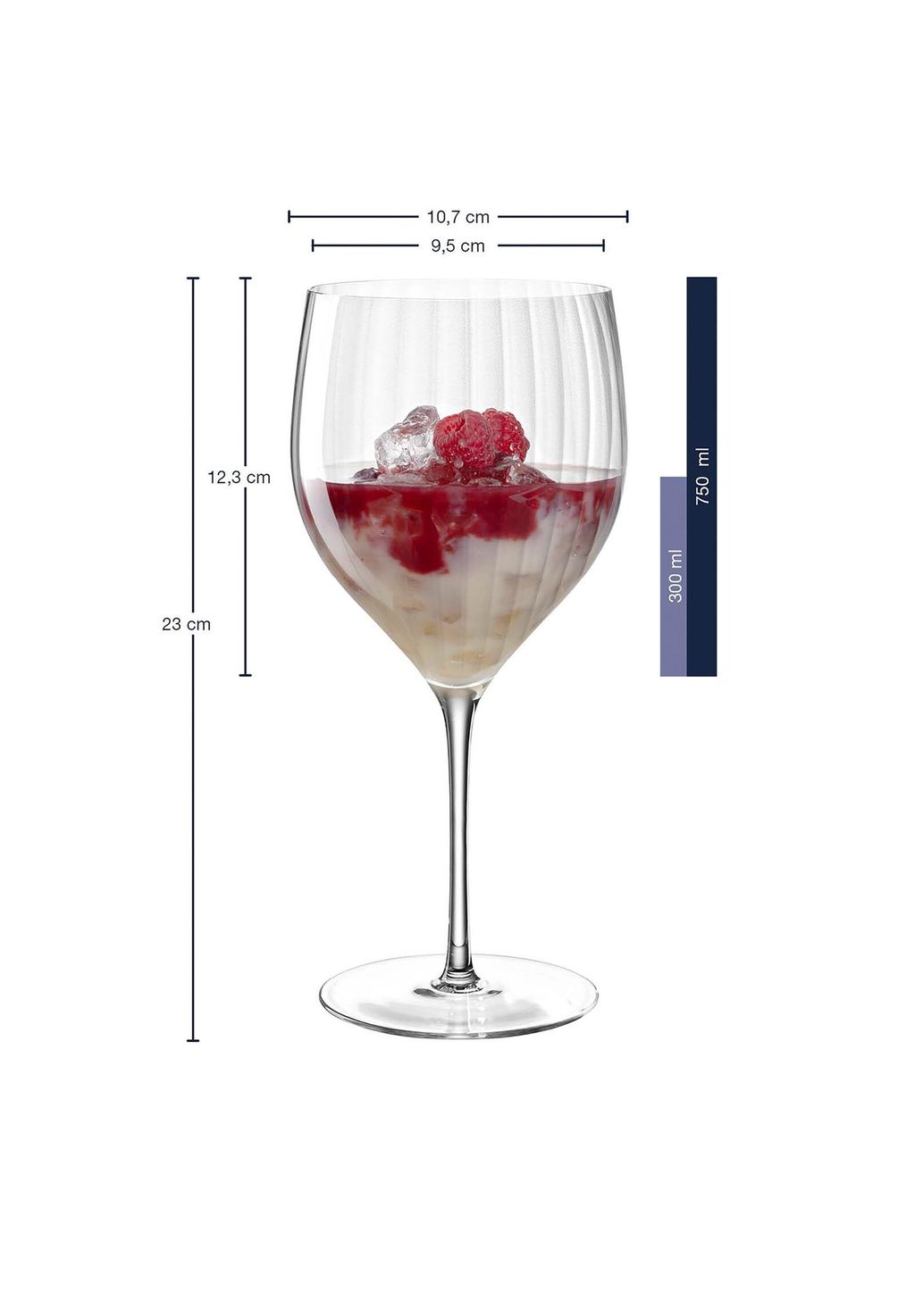 Комплект поставки и размеры: 6 коктейльных бокалов, размеры бокала: 23 x 10,7 см (В x Ш), Ø 9,5 см, высота чаши 12,3 см, 160 г, полезный объем 300 мл, 750 мл заполнены до краев.