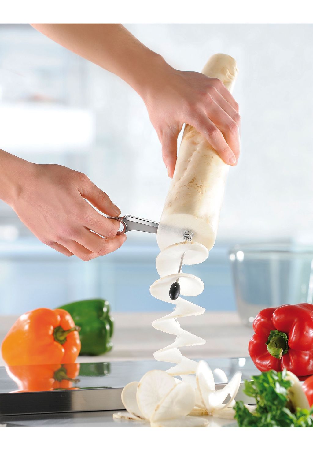 Особенности: Создает декоративные спирали из редиса и других твердых овощей.