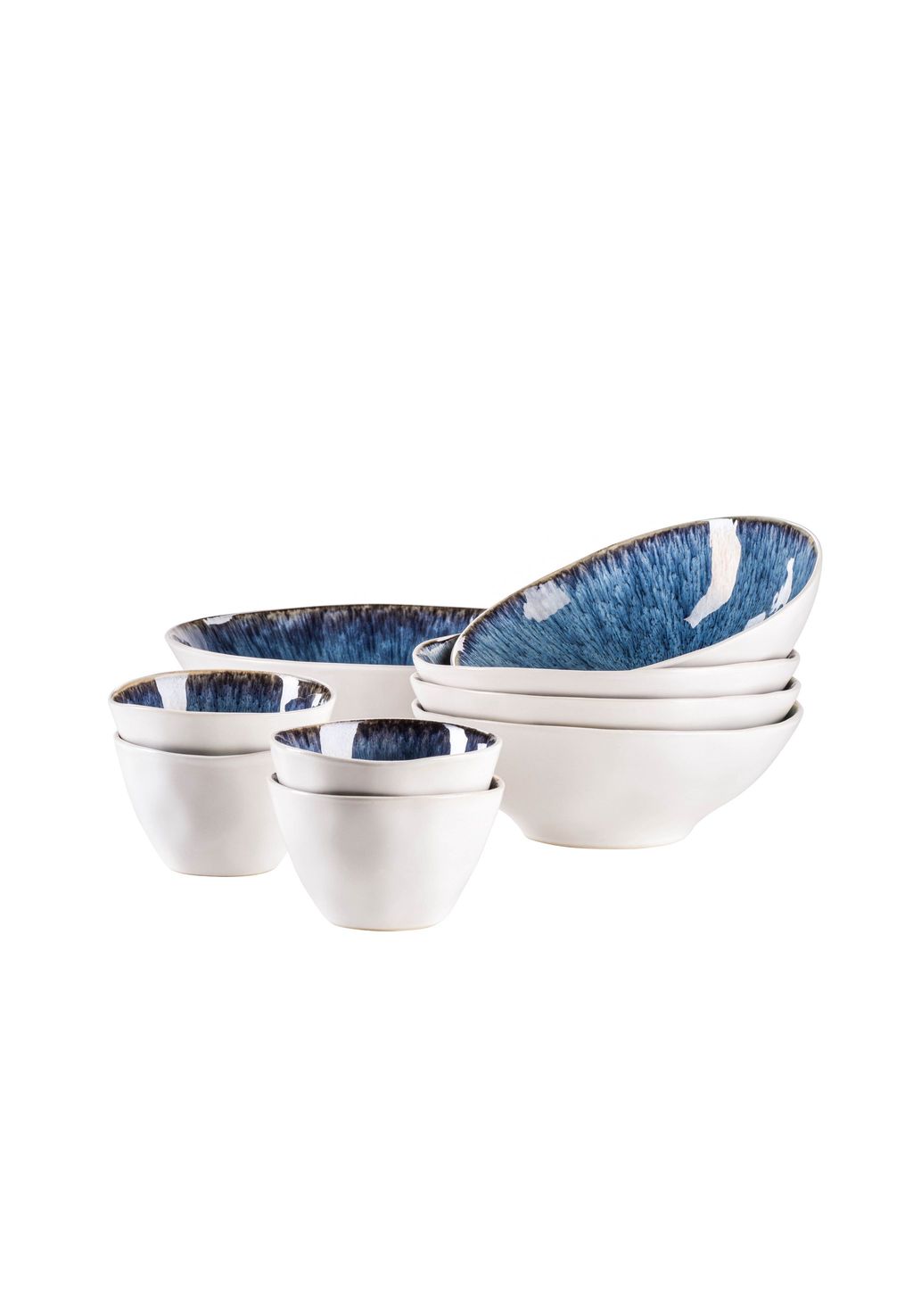 Особенности: Элегантный керамический набор мисок в винтажном стиле, состоящий из 1 салатницы (Ø 25,5 см, 1 л), 4 больших мисок для хлопьев (Ø 19,5 см, 590 мл) и 4 высоких мисок для соуса (Ø 10,5 см, 240 мл).