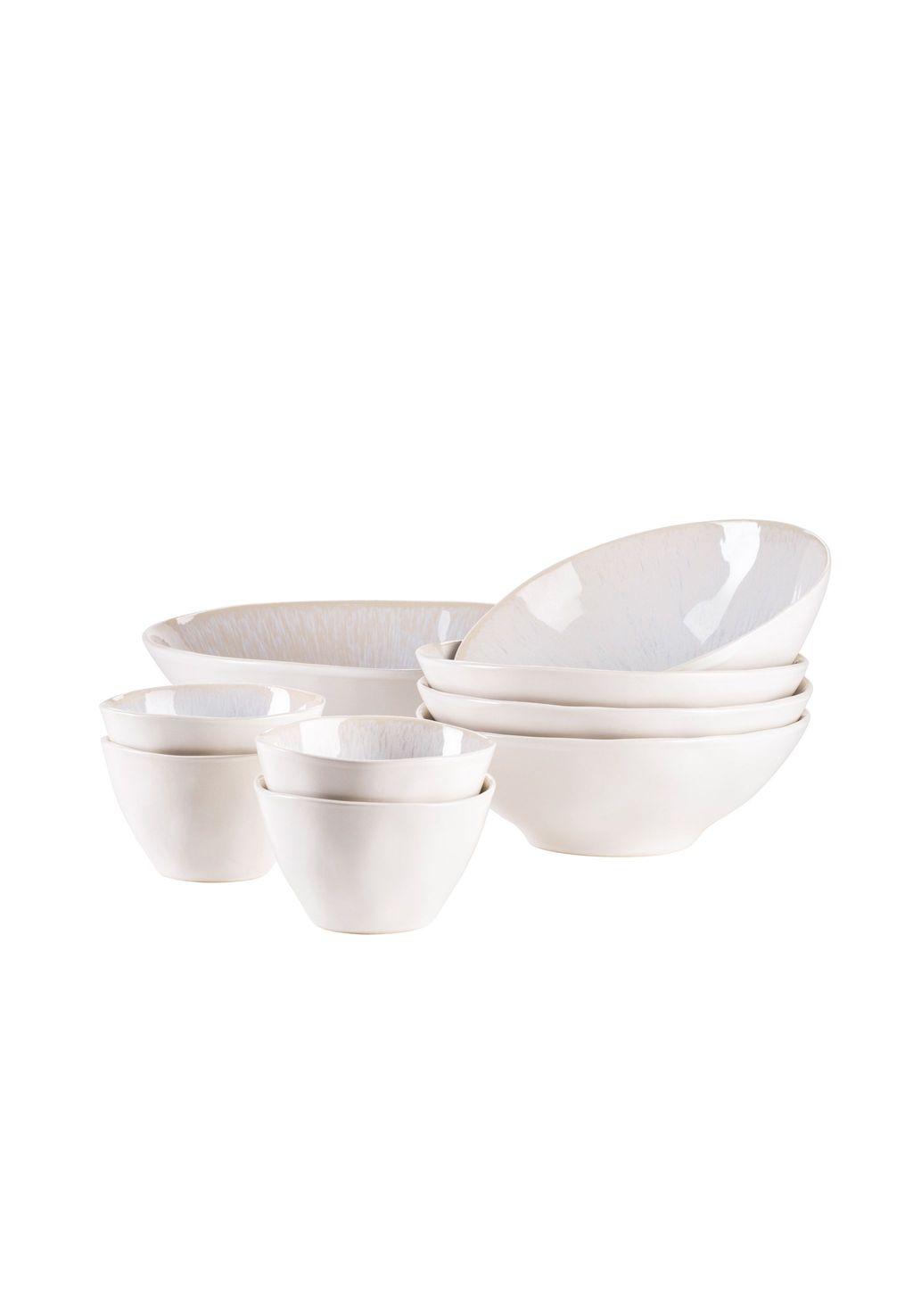 Особенности: Элегантный керамический набор мисок в винтажном стиле, состоящий из 1 салатницы (Ø 25,5 см, 1 л), 4 больших мисок для хлопьев (Ø 19,5 см, 590 мл) и 4 высоких мисок для соуса (Ø 10,5 см, 240 мл).