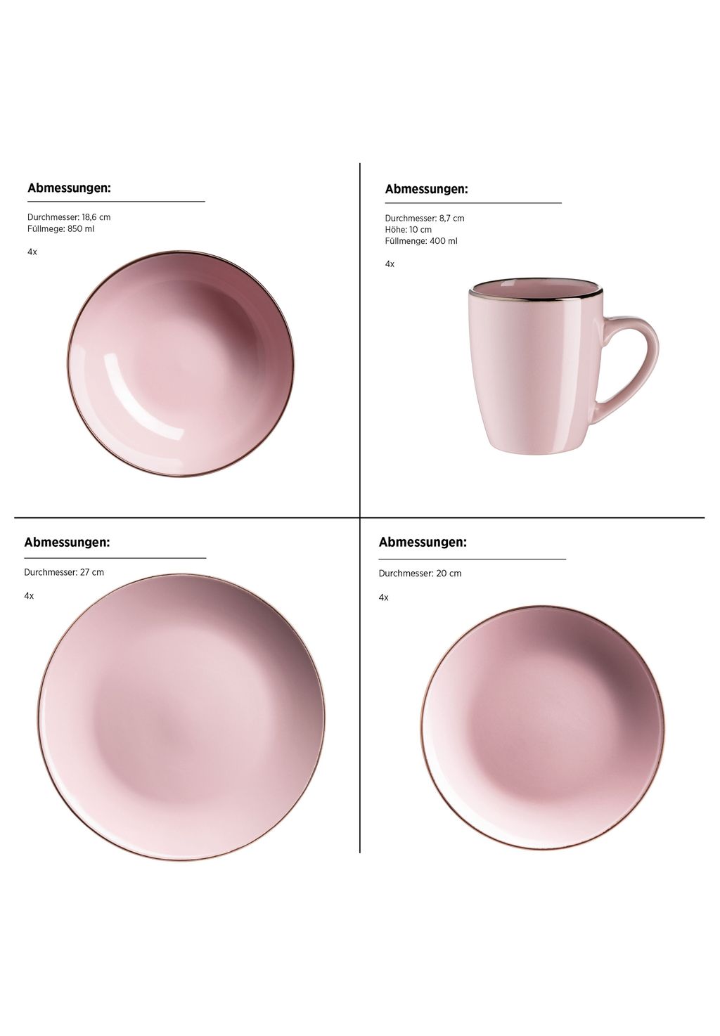 Особенности: Этот современный набор столовых приборов содержит 4 плоские обеденные тарелки (Ø 27 см), 4 десертные тарелки (Ø 19,6 см), 4 кофейные кружки (емкостью 400 мл) и 4 многоцелевые миски (Ø 18,6 см, 700 мл)