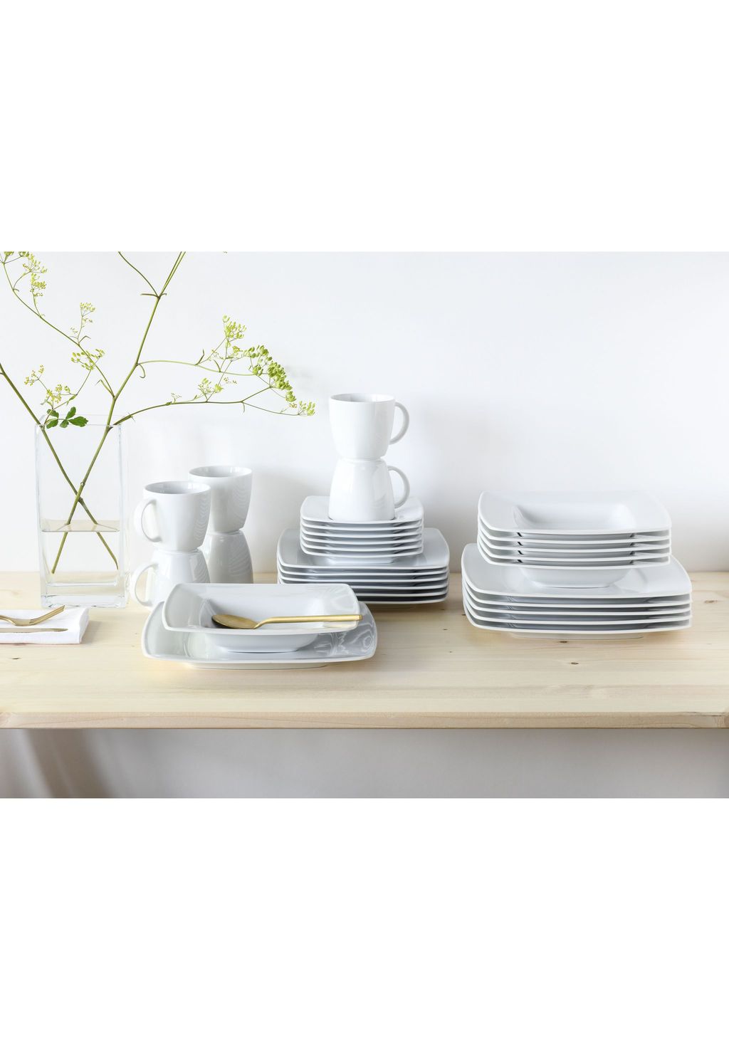 Описание товара: Серия Victoria White, сервиз из 30 предметов, высококачественный фарфор, сделано в Европе. Подходит для 6 человек. Состоит из: 6 обеденных тарелок 26 см, 6 суповых тарелок 22 см, 6 десертных тарелок 21 см, 6 чашек 20 мл и 6 блюдец 14 см. Современная, округлой квадратной формы в классическом белом цвете. Можно мыть в посудомоечной машине и использовать в микроволновой печи.
