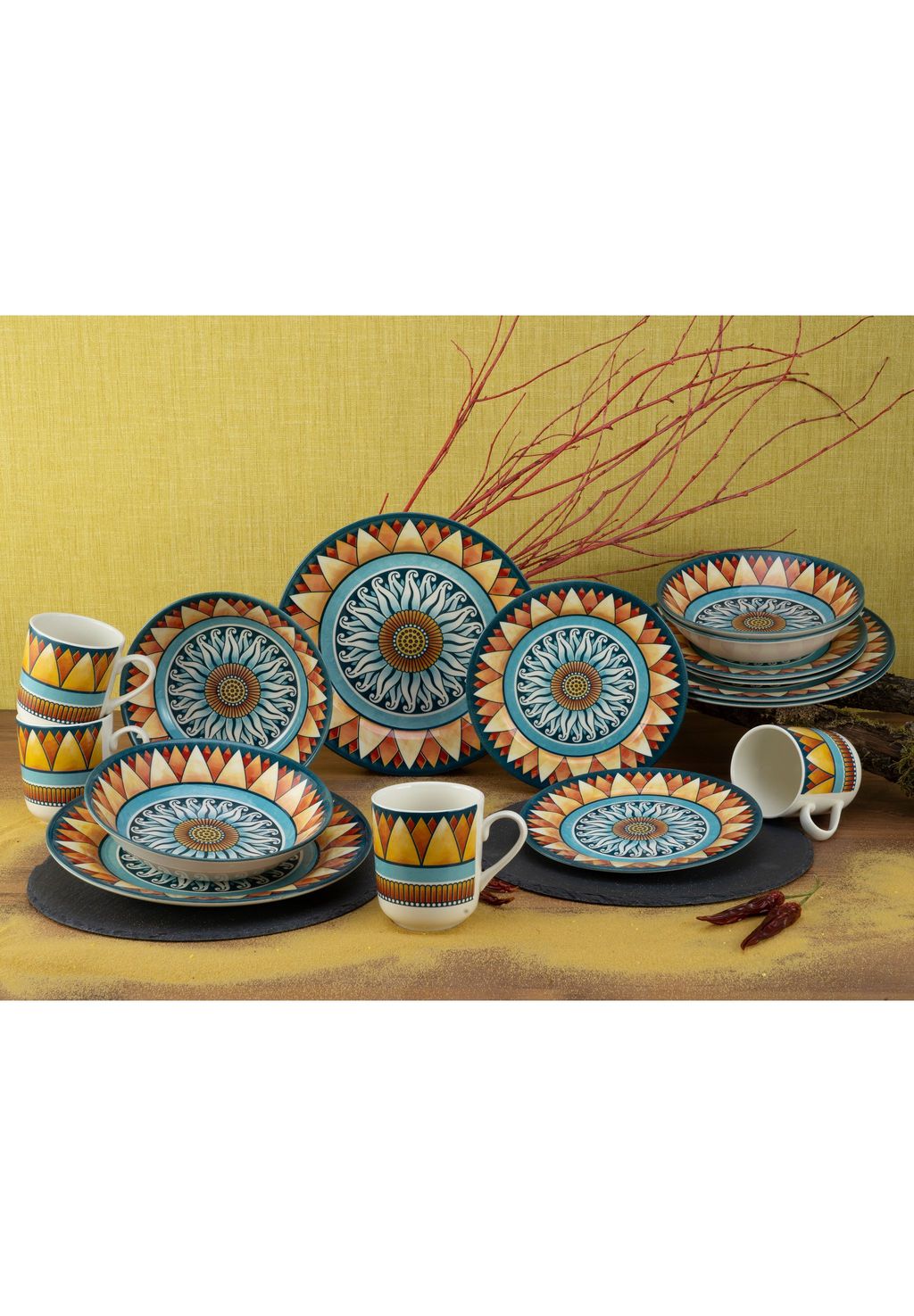 Описание товара: Этот набор столовых приборов представляет собой комбинацию из 16 предметов, состоящую из обеденного сервиза (т.е. набора тарелок) и кофейного сервиза. Состав набора следующий: - 4 обеденные тарелки 26 см - 4 десертные тарелки 21 см - 4 миски/многофункциональные миски 20 см - 4 кофейные кружки 340 мл. Набор рассчитан на 4 персоны, но, конечно, его можно расширить по мере необходимости, например, на 6 или 8 персон, а для больших мероприятий даже на 12 персон. Набор столовых приборов изготовлен из качественной керамической плитки и украшен ярким сплошным декором с центральным мотивом солнца в средиземноморском стиле, дополнительно украшенным искусно выполненными восточными и изразцовыми мотивами. Посуда CreaTable "Soleil": "Для особого стола"!