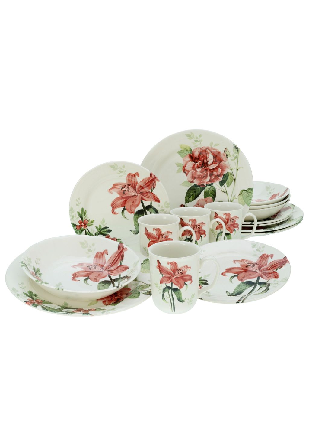 Описание товара: Вы получите традиционный набор из 16 предметов, изготовленный из высококачественной керамики, в следующем составе: - 4 обеденные тарелки 26 см - 4 десертные тарелки 21 см - 4 кофейные кружки 34 сл - 4 многофункциональные миски 20 см. На посуде изображен традиционный пейзажный мотив с роскошными розами и цветами в качестве центрального мотива. Набор сияет своим экстра-белым корпусом и классическим декором в винтажном стиле. "Розмарин": Прекрасный сад на вашем столе!