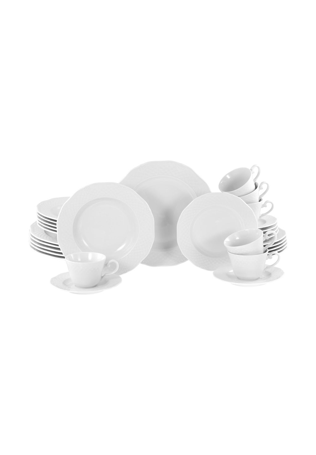Комплект поставки: 6 обеденных тарелок 26 x 26 x 2 см, 580 г | 6 суповых тарелок 22,5 x 22,5 x 3,5 см, 400 г, 300 мл | 6 десертных тарелок 19 x 19 x 2 см, 260 г | 6 кофейных чашек 9 x 9 x 6,5 см, 140 г, 200 мл | 6 кофейных блюдец 16 x 16 x 2 см, 200 г