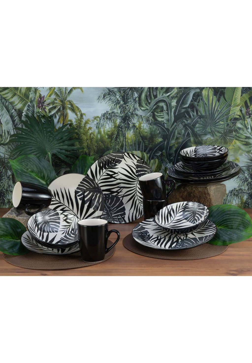Описание товара: Вы получите исключительный сервиз из 16 предметов (комбинация набора тарелок и кофейного сервиза) из высококачественной керамики, в состав которого входят: - 4 обеденные тарелки (27 см) - 4 десертные тарелки (21 см) - 4 многофункциональные миски (19 см) - 4 кофейные кружки (30 сл). Название говорит само за себя. Набор посуды имеет современную форму «купе» с рисунком тропических листьев по всей поверхности, а внешняя и нижняя части выполнены в глянцевом, глубоком черном цвете! «Tropicana Black»: захватывающе экзотично!