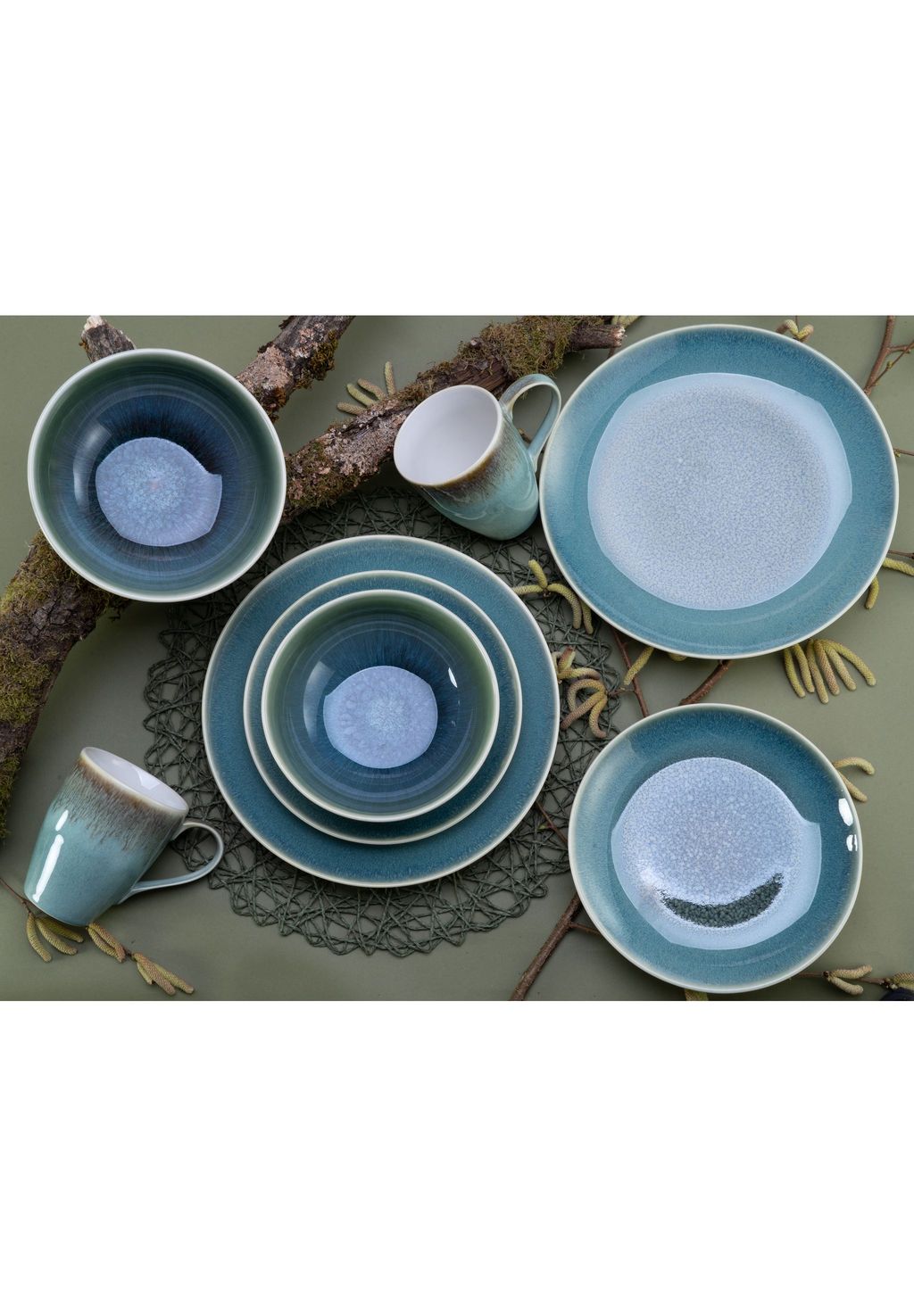 Описание товара: Этот набор столовых приборов представляет собой комбинацию из 8 предметов, состоящую из обеденного сервиза (т.е. набора тарелок) и кофейного сервиза. Состав набора: - 2 обеденные тарелки 27 см; - 2 десертные тарелки 21 см; - 2 многофункциональные миски 16 см; - 2 кофейные кружки 300 мл. Набор рассчитан на 2 персоны, но, конечно, его можно расширить при необходимости, например, на 4 или 6 человек, а для больших мероприятий – на 12 человек. Набор столовых приборов изготовлен из качественного керамического сырья и покрыт переливающейся глазурью ярких цветов: песочного, синего, голубого и зеленого. Двухцветная глазурь, каждый из которых имеет глянцевую белую поверхность, придает посуде великолепные оптические эффекты и гладкую поверхность. Посуда CreaTable "Caldera Green" из серии "Caldera": Необыкновенная игра цветов!