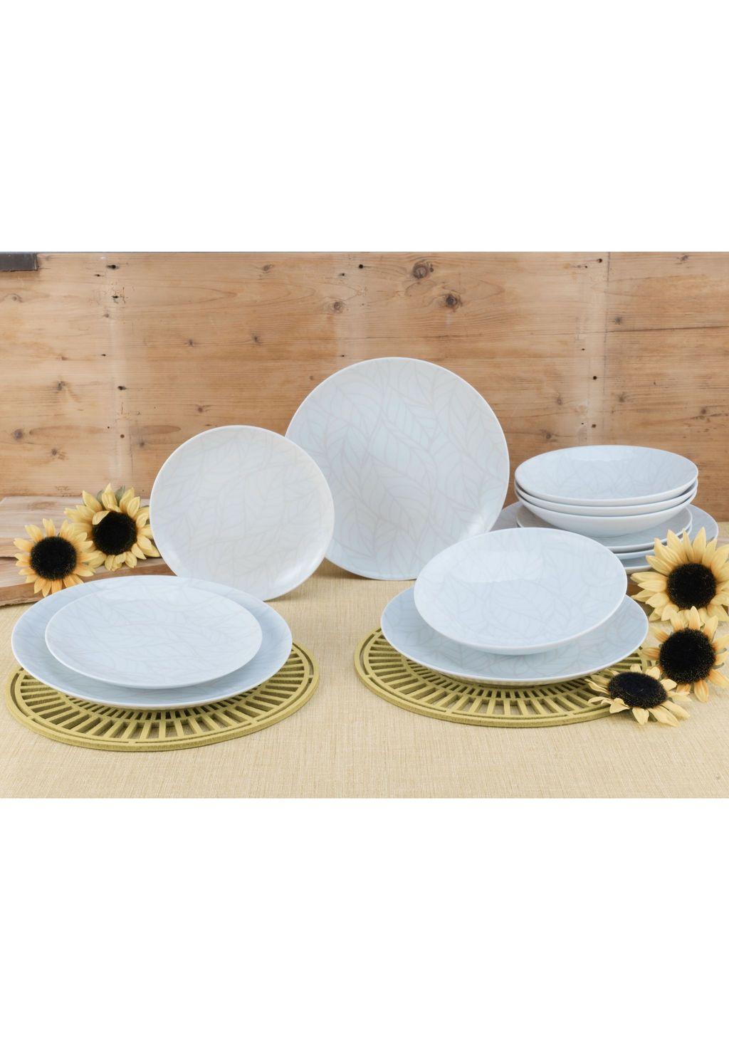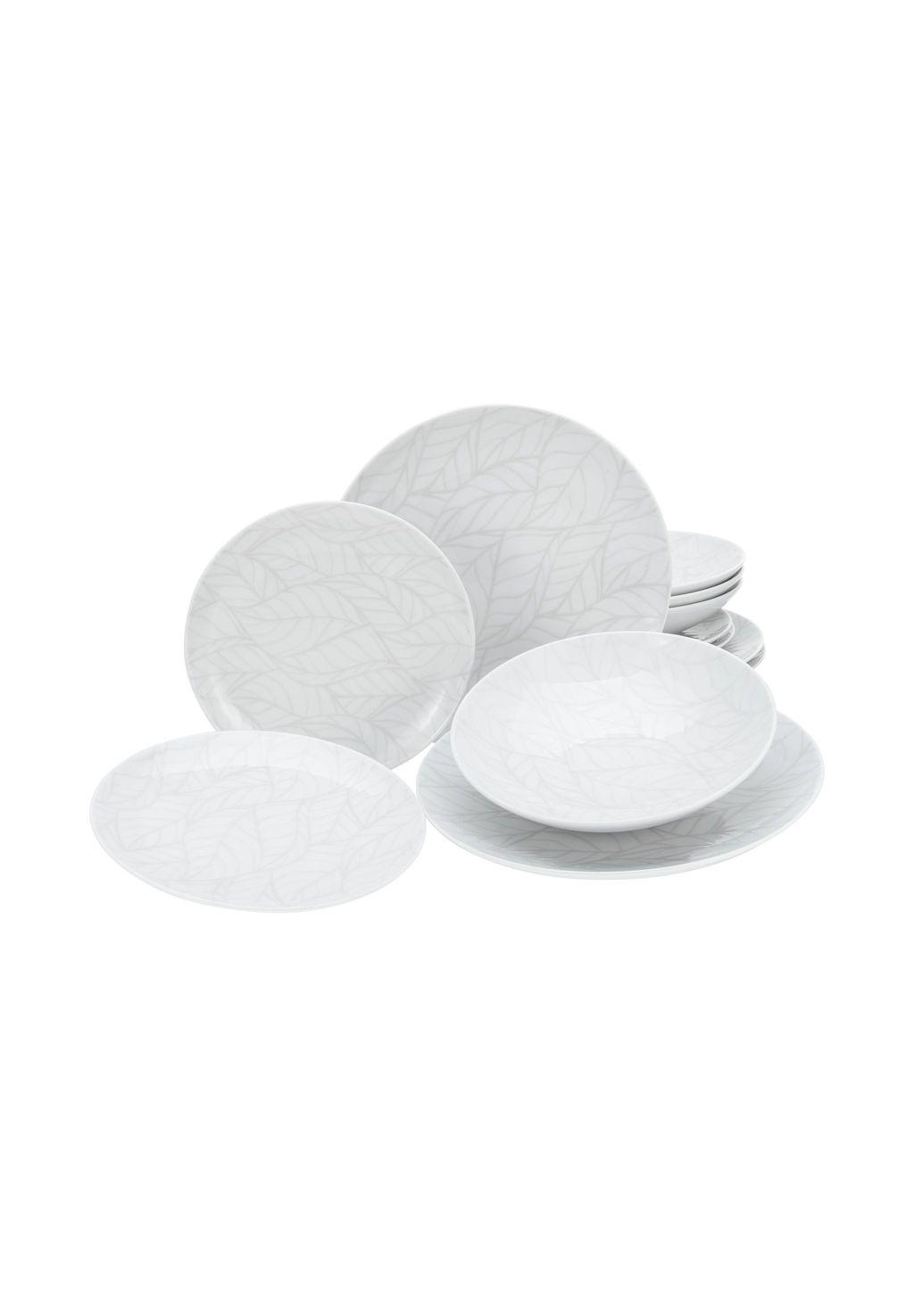 Описание товара: Этот набор столовых приборов представляет собой классический набор из 12 предметов. В набор входят: - 4 обеденные тарелки диаметром 27 см; - 4 десертные тарелки диаметром 21 см; - 4 суповые/пастовые тарелки. Набор рассчитан на 4 персоны, но его можно расширить, например, на 6 персон или для больших мероприятий на 12 персон. Набор столовых приборов, изготовленный из высококачественного фарфора «Made in Europe», имеет авангардную форму купе в элегантном, неподвластном времени дизайне. Модные мотивы листьев представлены здесь в виде текстильного принта, выполненного по всей поверхности, с лёгким рельефом в винтажном стиле. Посуда CreaTable «Leaves» из серии «Home»: современная и стильная посуда на каждый день!