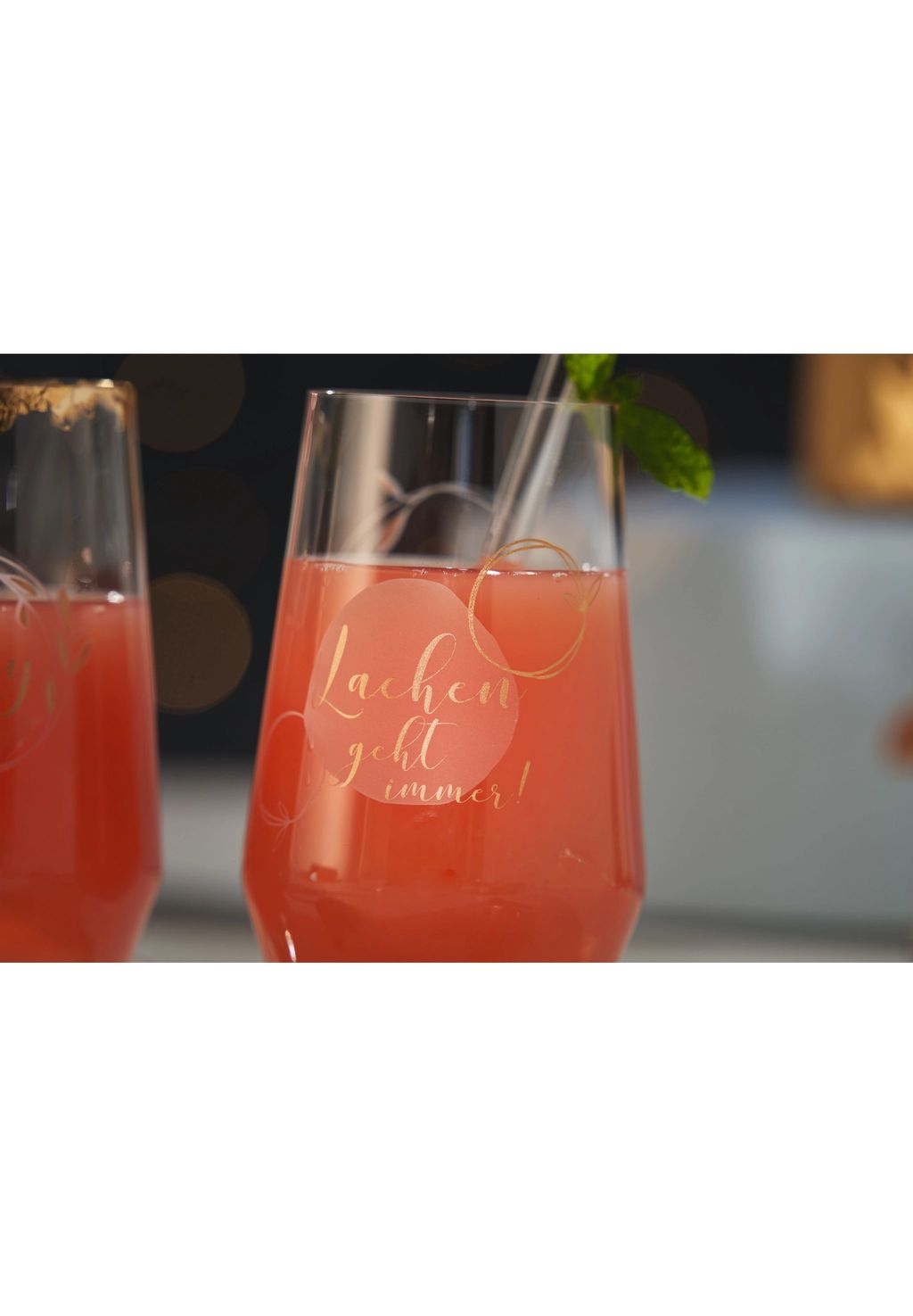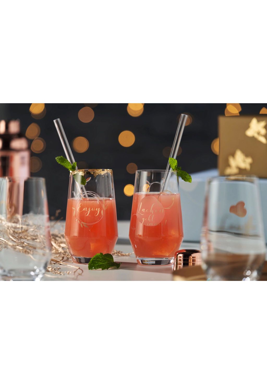 Описание товара: Эти два стакана с надписями «Enjoy» и «Lachen geht immer» (Смех — всегда хорошая идея) со стеклянными трубочками — отличный вариант подарка в оригинальной упаковке. Они идеально подойдут в качестве подарка на день рождения вашей девушке или парню. Они выразят вашу любовь без лишних слов. Этот барный стакан идеально подходит для классических лонг-дринков и коктейлей, а также для безалкогольных напитков. Стекло Teqton гарантирует стойкий блеск и прозрачность, сохраняя кристальную чистоту в течение длительного времени. Его можно мыть в посудомоечной машине, что делает его особенно практичным для повседневного использования. Набор состоит из двух стаканов с двумя стеклянными трубочками. Вам не нужно больше ждать! Вы тоже можете насладиться этим прекрасным набором стаканов! Также отличный выбор для подарка!