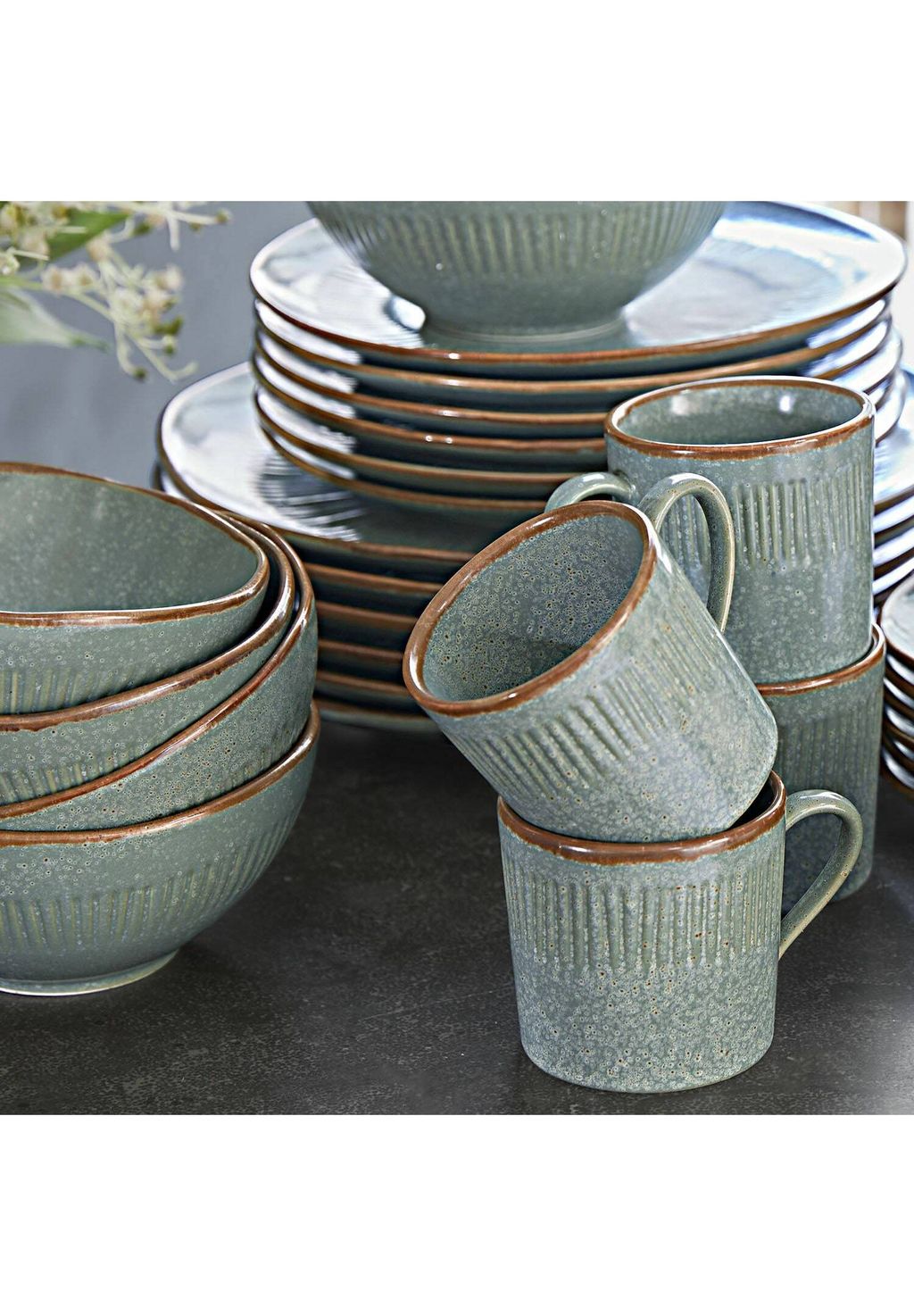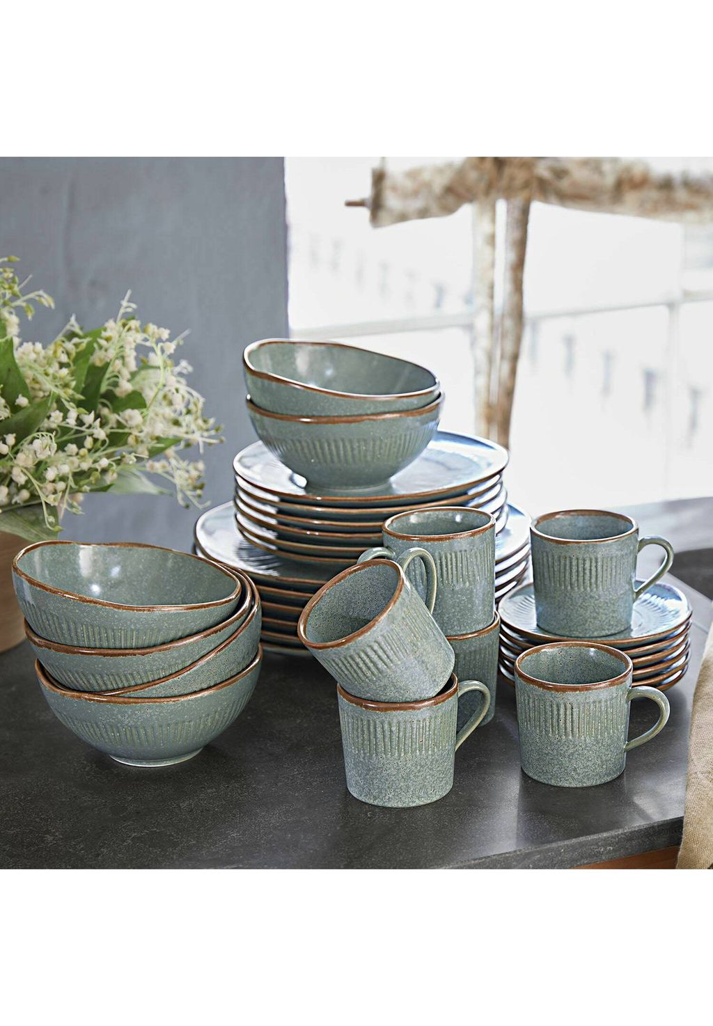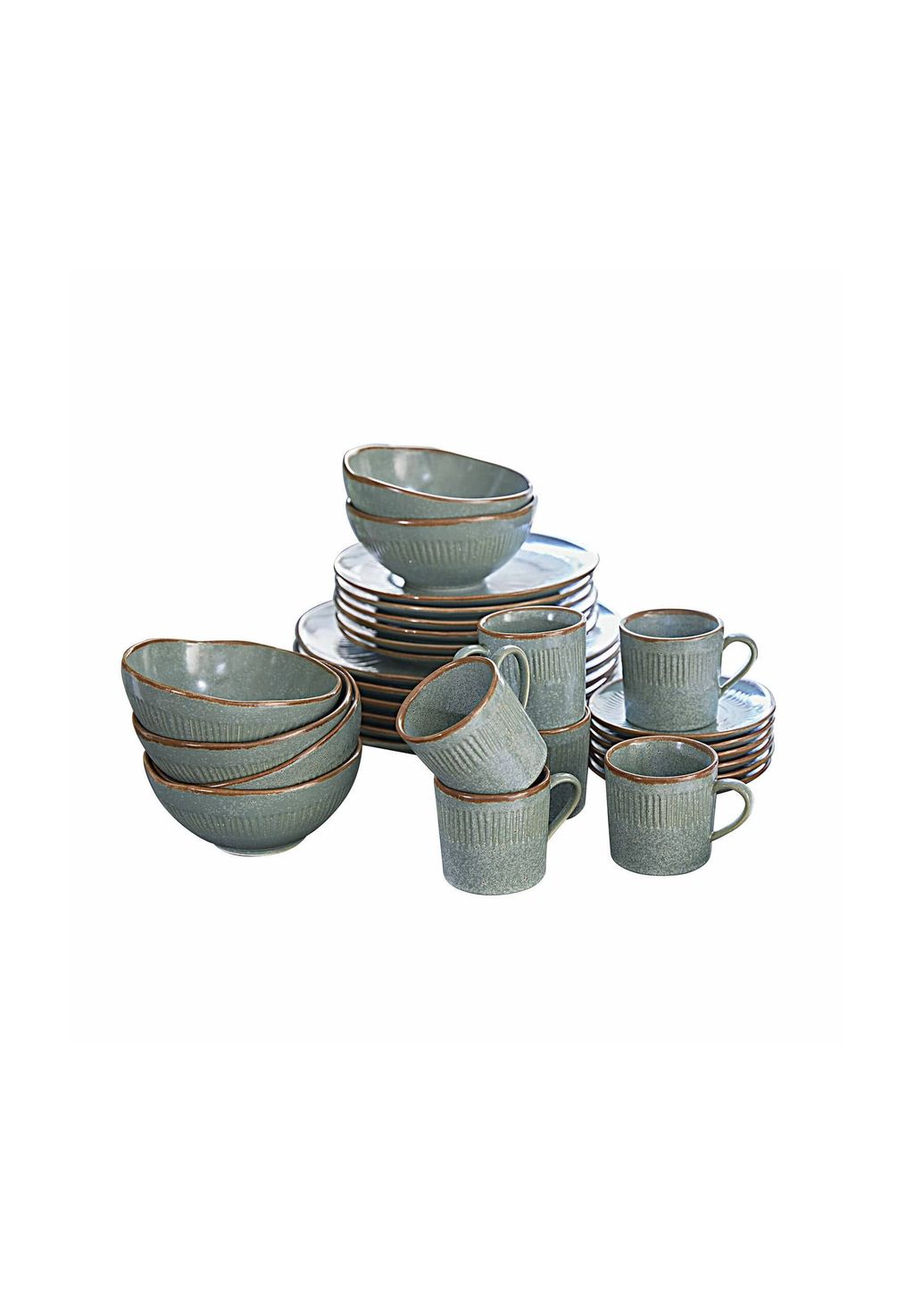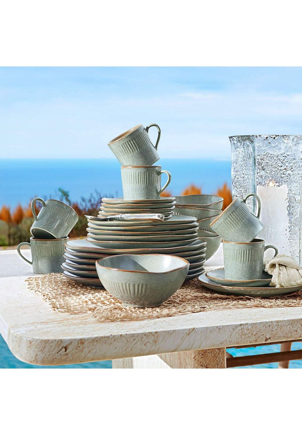 Описание товара: С подлинным очарованием уникальных изделий ручной работы. Высококачественная глиняная посуда с художественным ребристым узором. Можно мыть в посудомоечной машине и микроволновой печи. Этот набор столовых приборов из 30 предметов — эксклюзивное творение, которое произведет фурор на вашем столе. Намеренно неровный рисунок, особенно заметный на тарелках и мисках, эффектно контрастирует с равномерным, объемным ребристым узором, придавая посуде индивидуальный штрих. Будь то завтрак, небольшой обед, кофе или ужин — 6 чашек с блюдцами, большие и маленькие тарелки и миски идеально подойдут для непринужденных трапез в кругу семьи и хороших друзей. Материал посуды также позволяет вам наслаждаться этими праздничными посиделками в непринужденной обстановке, так как набор столовых приборов изготовлен из высококачественной керамической посуды. Материал, который не только очень прочный, но в данном случае его можно мыть в посудомоечной машине и микроволновой печи.
