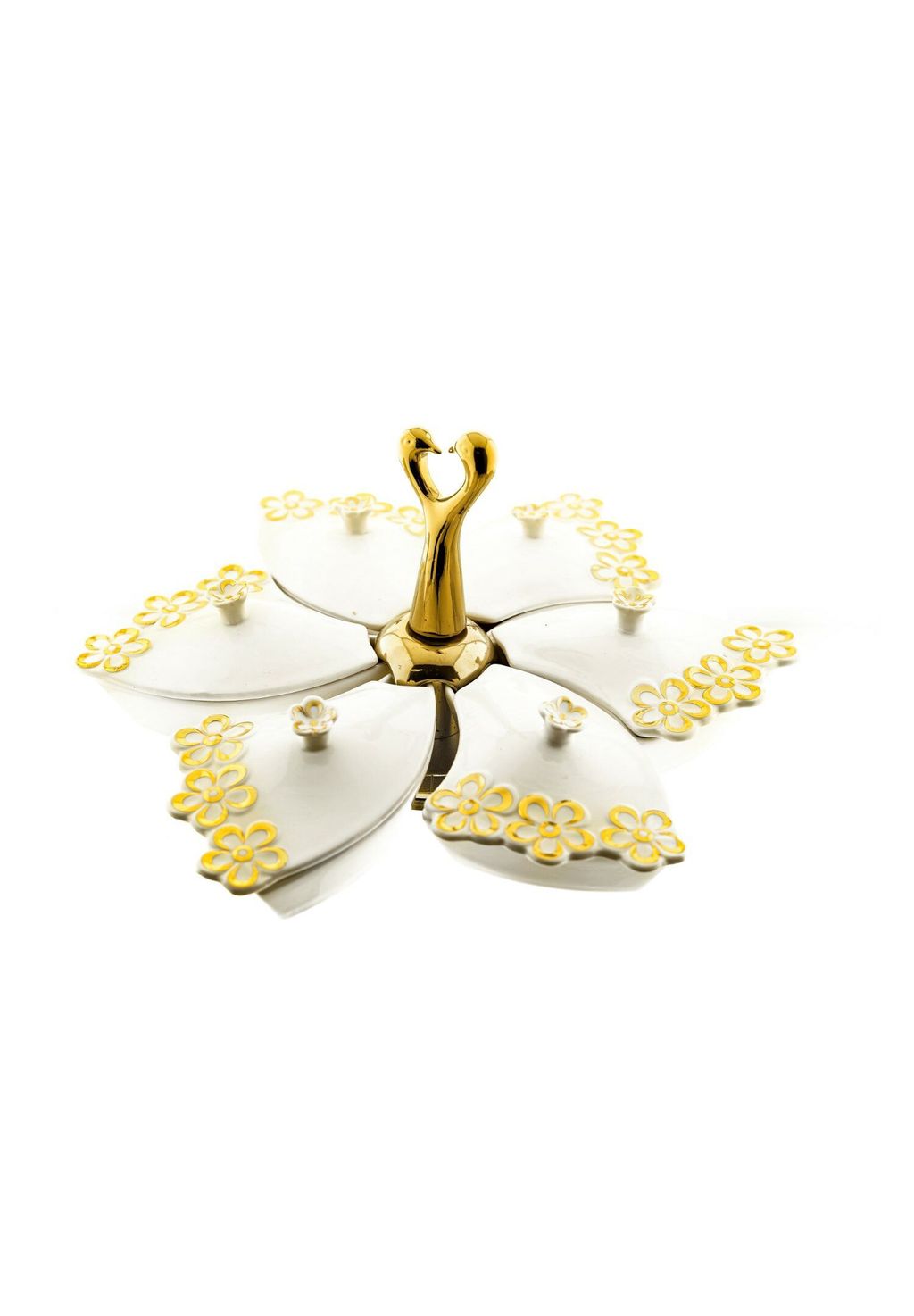 Этот набор из 6 мисок для закусок с белыми фарфоровыми мисками, золотой подставкой и цветочным узором не только стильно подаст закуски, но и станет элегантным украшением вашего стола. Сочетание высококачественного фарфора, вращающейся подставки и привлекательного цветочного узора делает этот набор привлекательным для особых случаев. Побалуйте себя и своих гостей визуальным и кулинарным шедевром с этим изысканным набором.