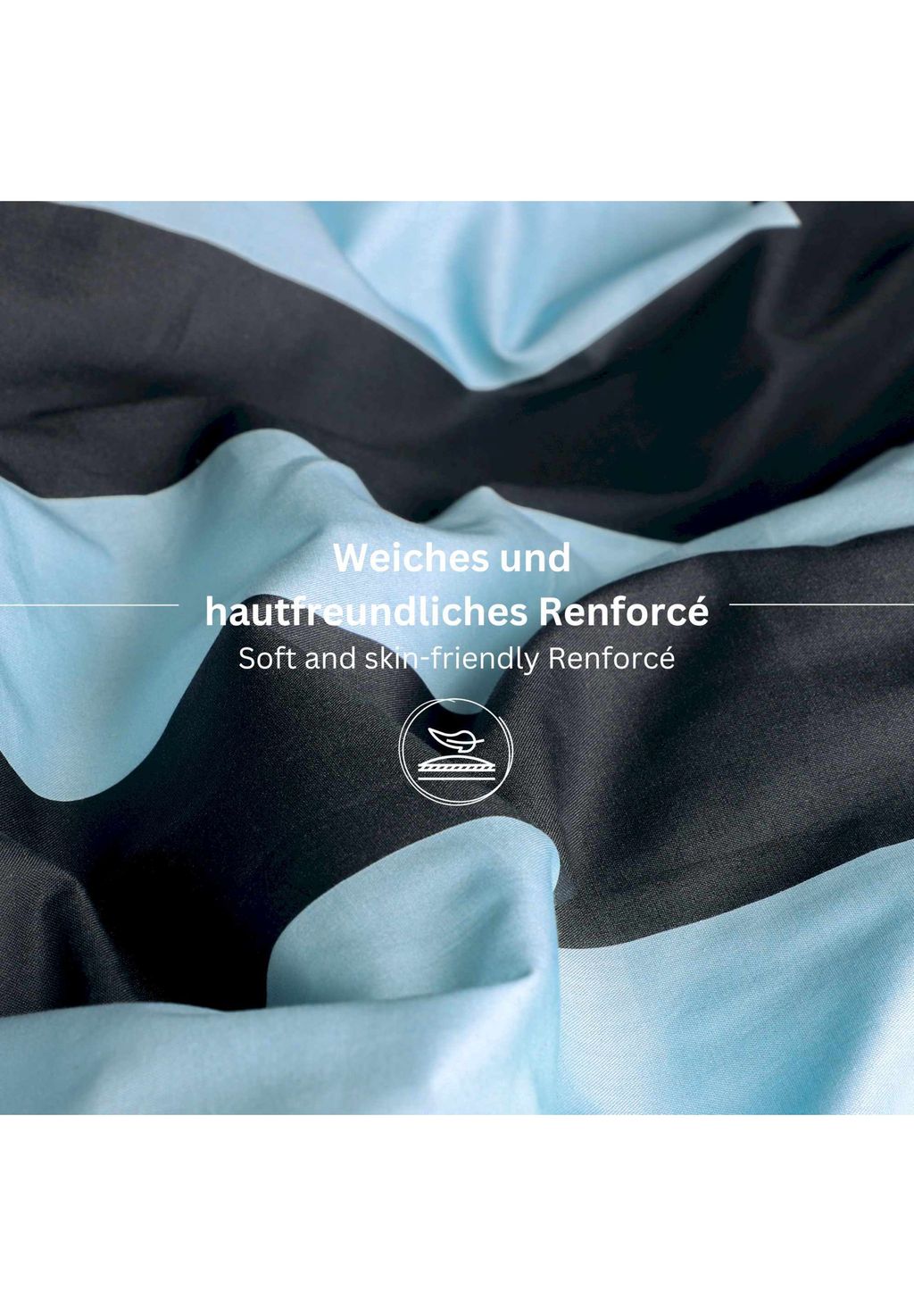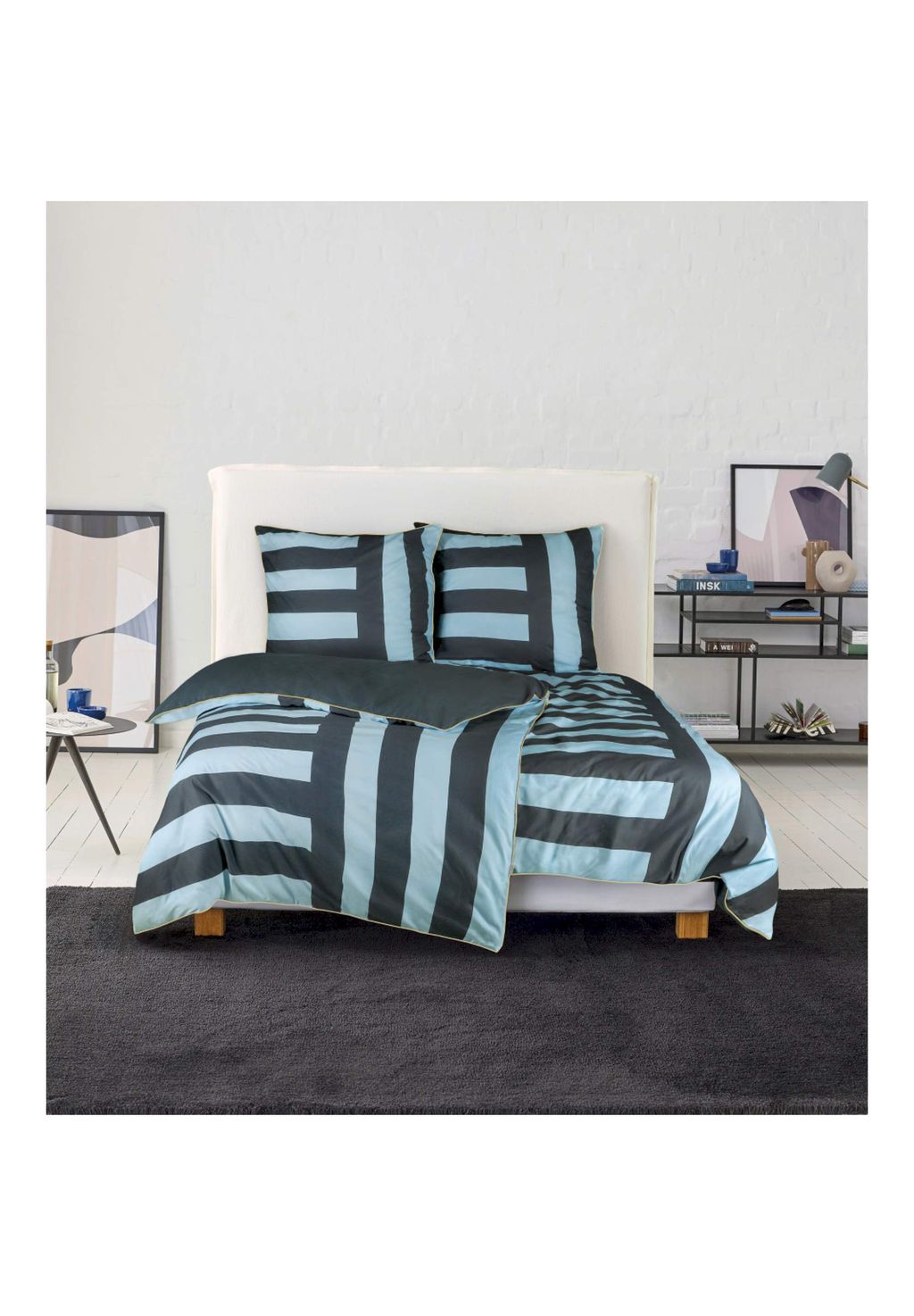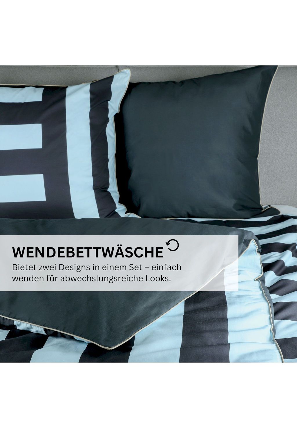 Постельное белье с горизонтальными полосками изготовлено из ренфорса, изготовленного из 100% хлопка Better Cotton. Узор «блочная полоска» сочетает в себе вертикальные и горизонтальные полосы, а изнаночная сторона, однотонная, темно-серого цвета, создает успокаивающий эффект. Благодаря плотности 144 нитей, пряжа сохраняет форму и остается мягкой. Обе версии застегиваются на молнию и сочетают в себе стиль, комфорт и экологичность.