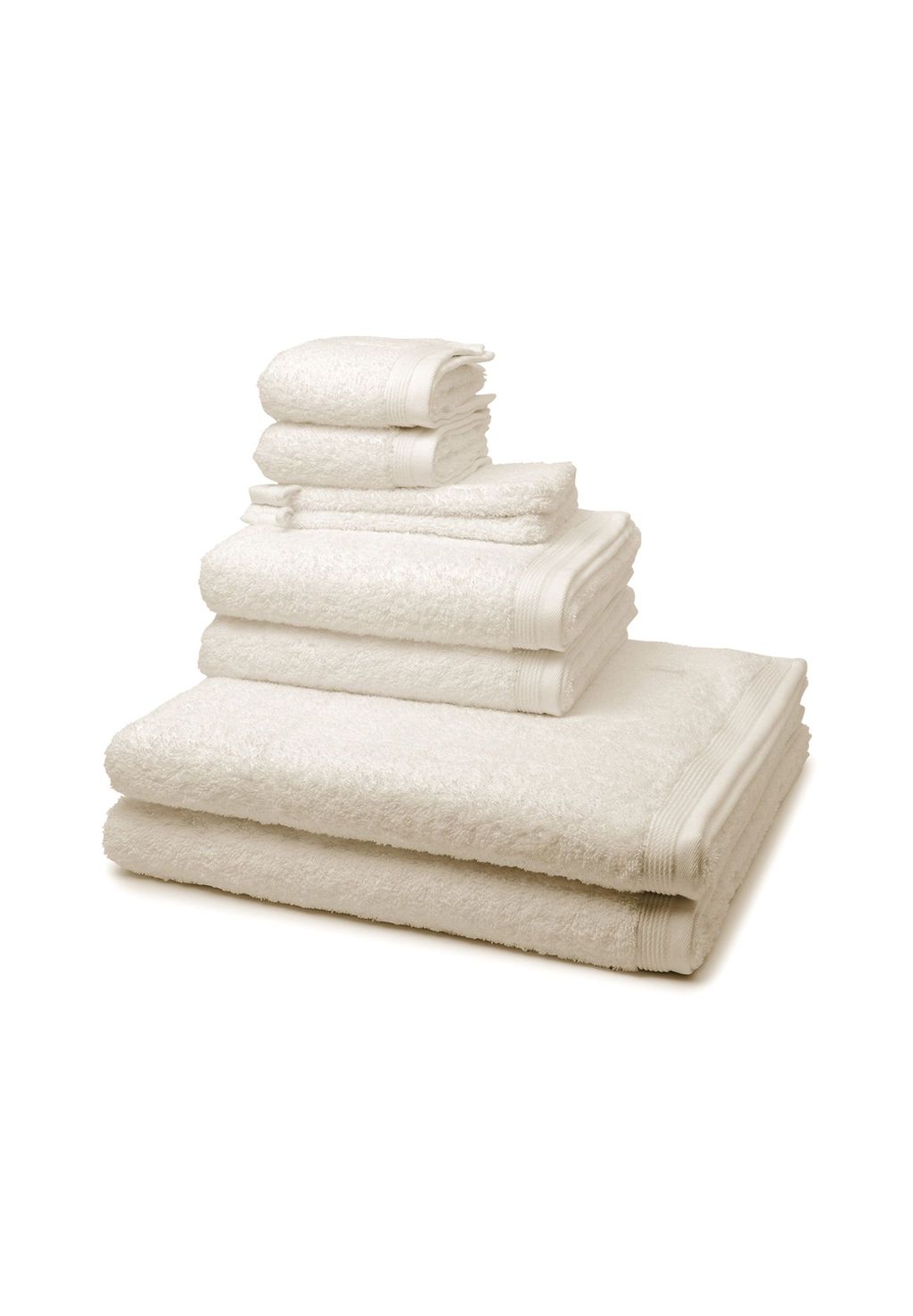 Особенности: 2 полотенца для рук (50 x 100 см), 2 банных полотенца (80 x 150 см), 2 гостевых полотенца (30 x 50 см), 2 варежки для мытья (15 x 20 см)