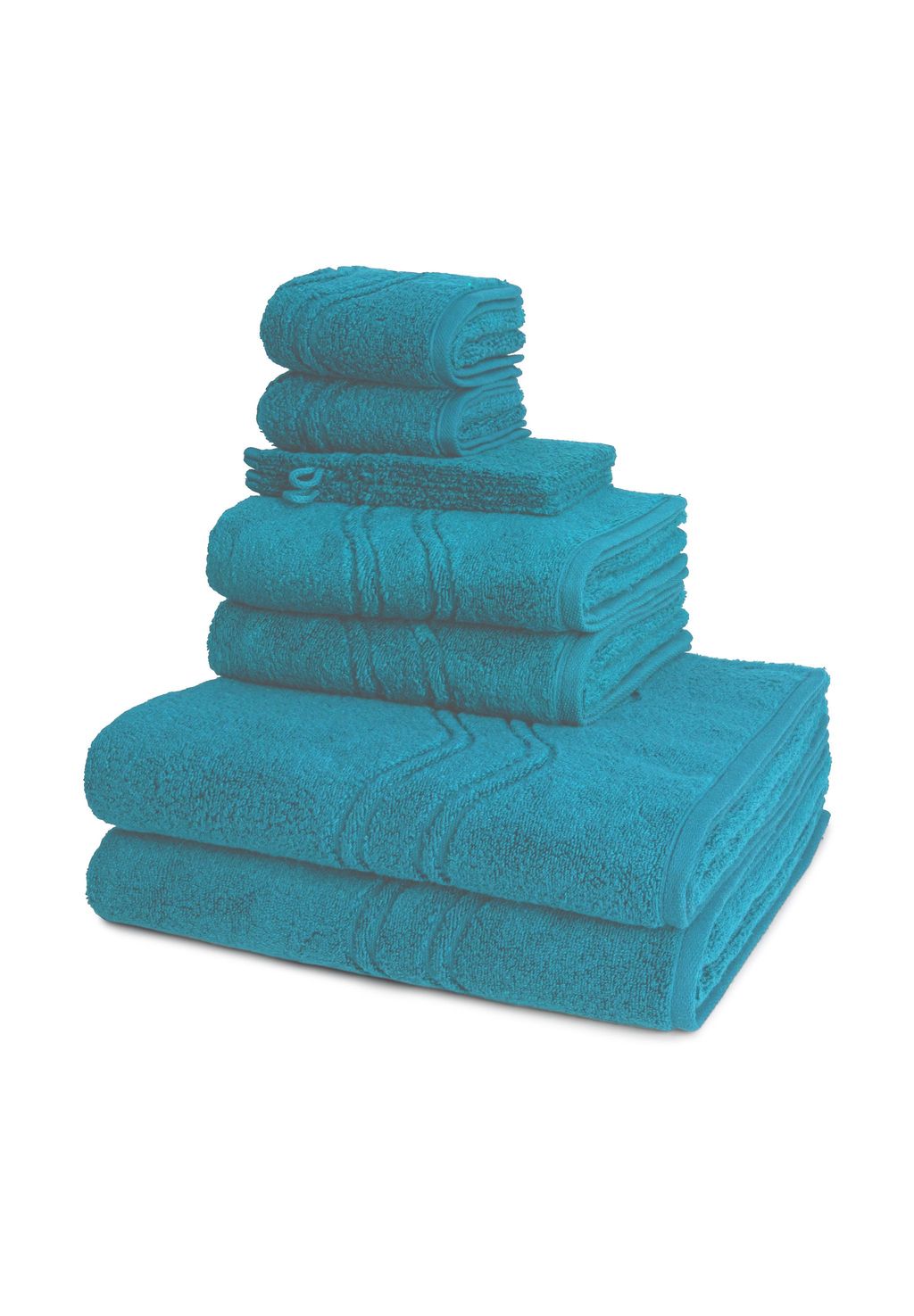 Особенности: 2 полотенца для рук (50 x 100 см), 2 банных полотенца (75 x 140 см), 2 гостевых полотенца (30 x 50 см), 2 варежки для мытья (16 x 22 см)