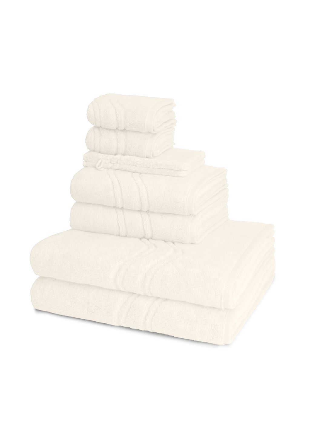 Особенности: 2 полотенца для рук (50 x 100 см), 2 банных полотенца (75 x 140 см), 2 гостевых полотенца (30 x 50 см), 2 варежки для мытья (16 x 22 см)