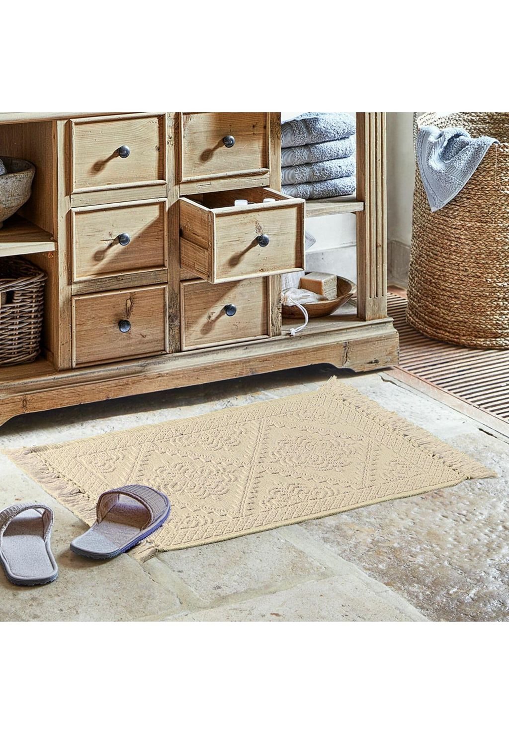 Описание товара: Высококачественный хлопковый жаккард для исключительного комфорта. Тонкая структура с детализированным узором. Мягкий и комфортный для вашей ванной комнаты. Коврик для ванной, сочетающий в себе комфорт и дизайн. Тонкий хлопковый жаккард с тонкой структурой обеспечивает приятные ощущения для кожи и высококачественный внешний вид. Идеально подходит для создания теплой, уютной атмосферы в вашей ванной комнате.