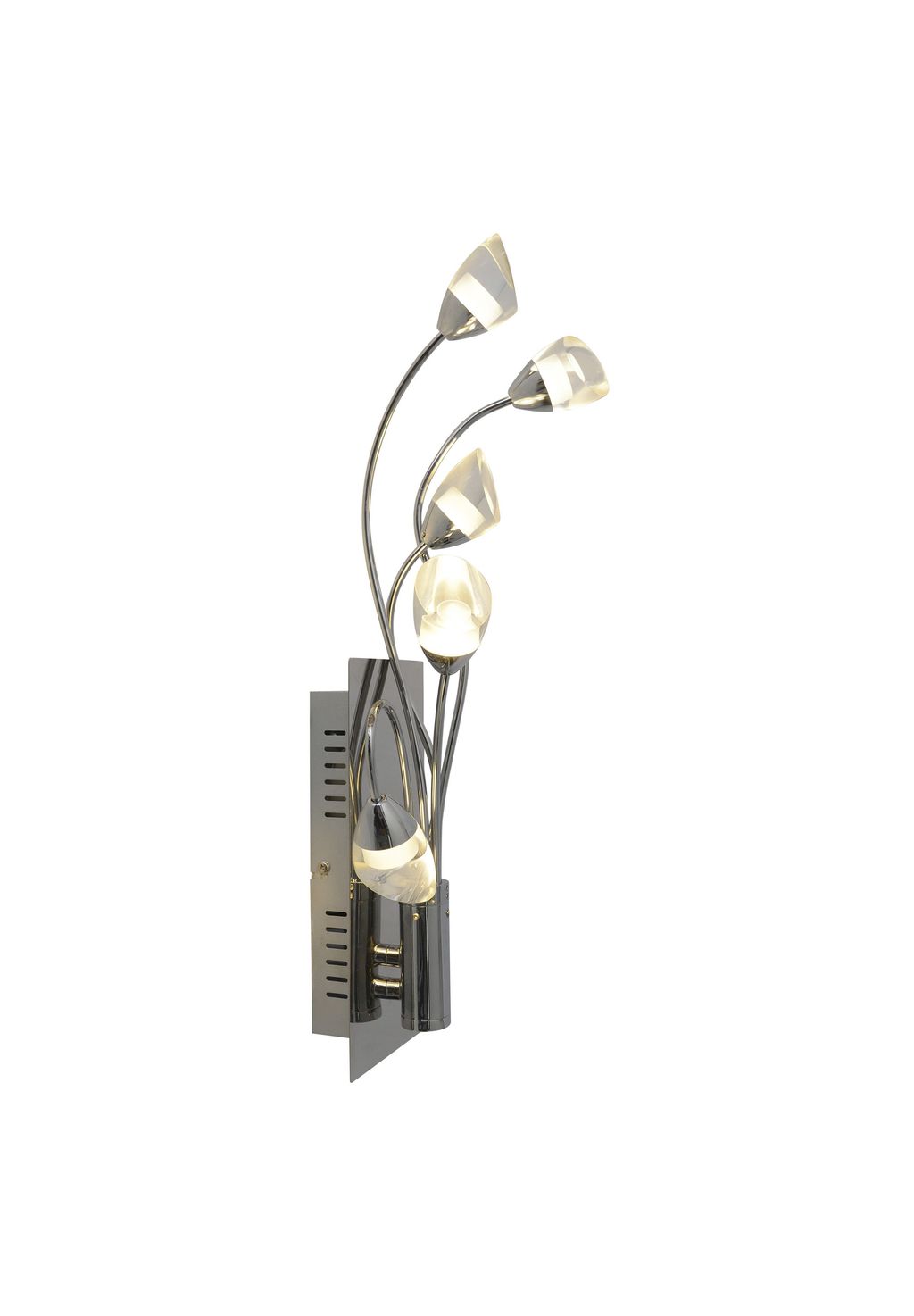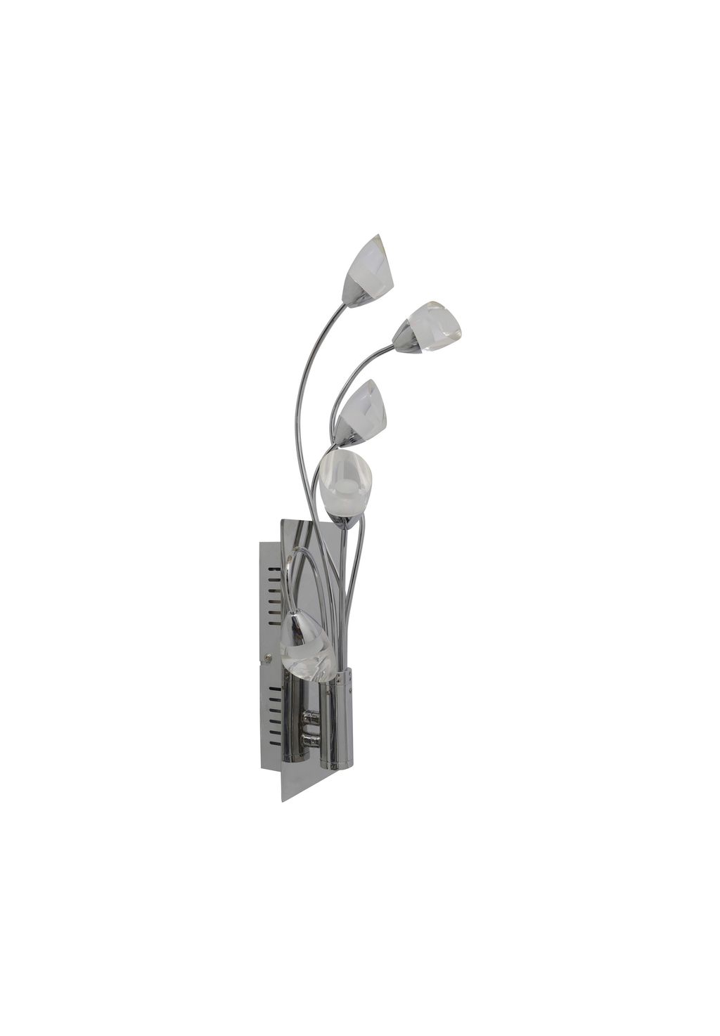 Особенности: в комплекте 5 светодиодов общей мощностью 12,5 Вт, цветовой температурой 3000 К; 250 лм; ресурсом 20 000 ч, степенью защиты IP 20 SK II, классом энергоэффективности G, в комплекте драйвер 100-240 В~ 50/60 Гц, 9-36 В постоянного тока, 350 мА, без регулировки яркости. Высота: 50 см; Ширина: 15 см. t: 12 см Материал: металл, акрил Цвет: хром, частично сатинированный