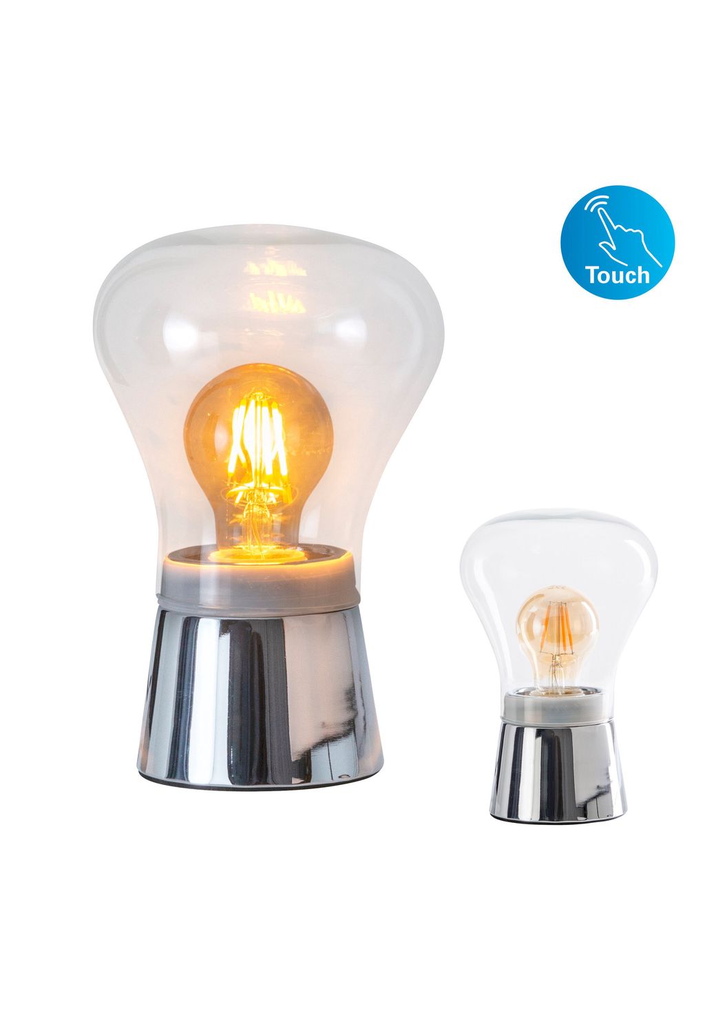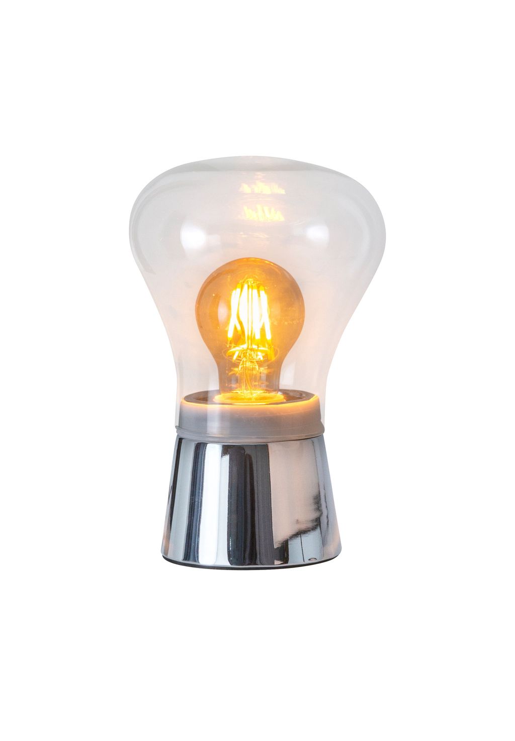 Особенности: 1 цоколь E27/макс. 40 Вт 220-240 В ~ 50|60 Гц без... Источник света IP20/SKII Кабель питания 150 см, черный Функция прикосновения Общая высота: 21 см Тонированный абажур: h: 15 см, d: 14 см Основание: h: 8 см; d: 10 см Материал: металл (железо), стекло Цвет: хром, прозрачный