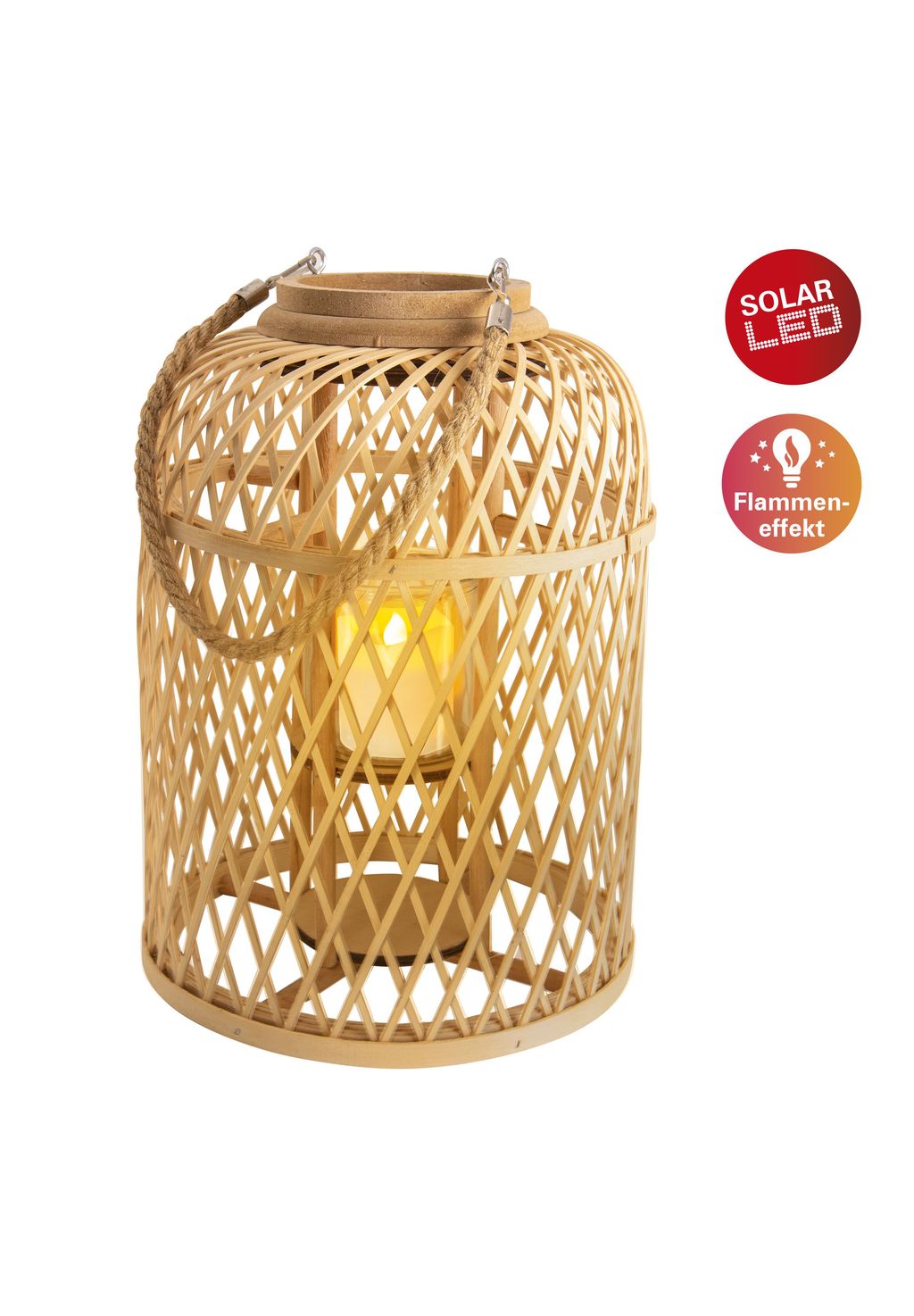 Фонарь-корзина: IP20; В: ок. 38 см / Г: ок. 27 см; Материал: дерево (бамбук) / джут / стекло; Цвет: натуральный / прозрачный; Солнечная светодиодная свеча: 0,06 Вт / 6 лм / 1700 K; IP44 / SKIII; В комплекте 1 аккумулятор Ni-MH / AAA / 400 мАч / 1,2 В; В: ок. 6 см / Г: ок. 5,2 см; Материал: пластик (ABS); Цвет: белый; Цвет света: теплый белый; Дополнительные характеристики: Вкл. эффект пламени; Вкл. ползунковый переключатель; Время горения: прибл. 6-8 ч