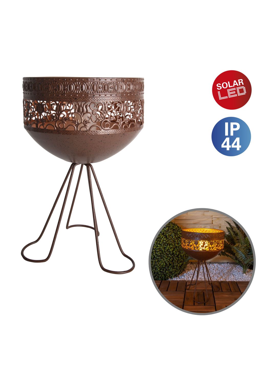 В комплекте 24x светодиода 0,05 Вт 3500 К/5 лм Продолжительность освещения после зарядки: прибл. 6 часов IP44/SKIII В комплекте 1x Ni-MH/AA/600 мАч/1,2 В аккумулятор В комплекте Солнечная панель 1,2 В/80 мА Высота: 34,5 см; Длина/Ширина: 22 см Материал: железо, пластик Цвет: ржавчина Цвет света: теплый белый В комплекте выключатель с эффектом пламени