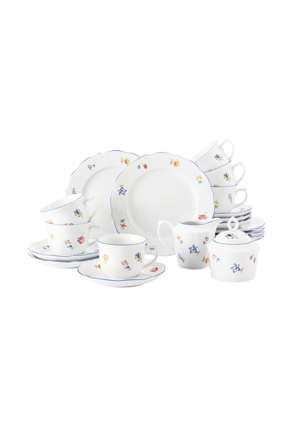 Особенности: Ностальгический декор в виде россыпи цветов: Нежный цветочный декор с незабудками, ромашками и клевером на белом фарфоре в обрамлении тонкого синего ободка — летний, игривый и элегантный.