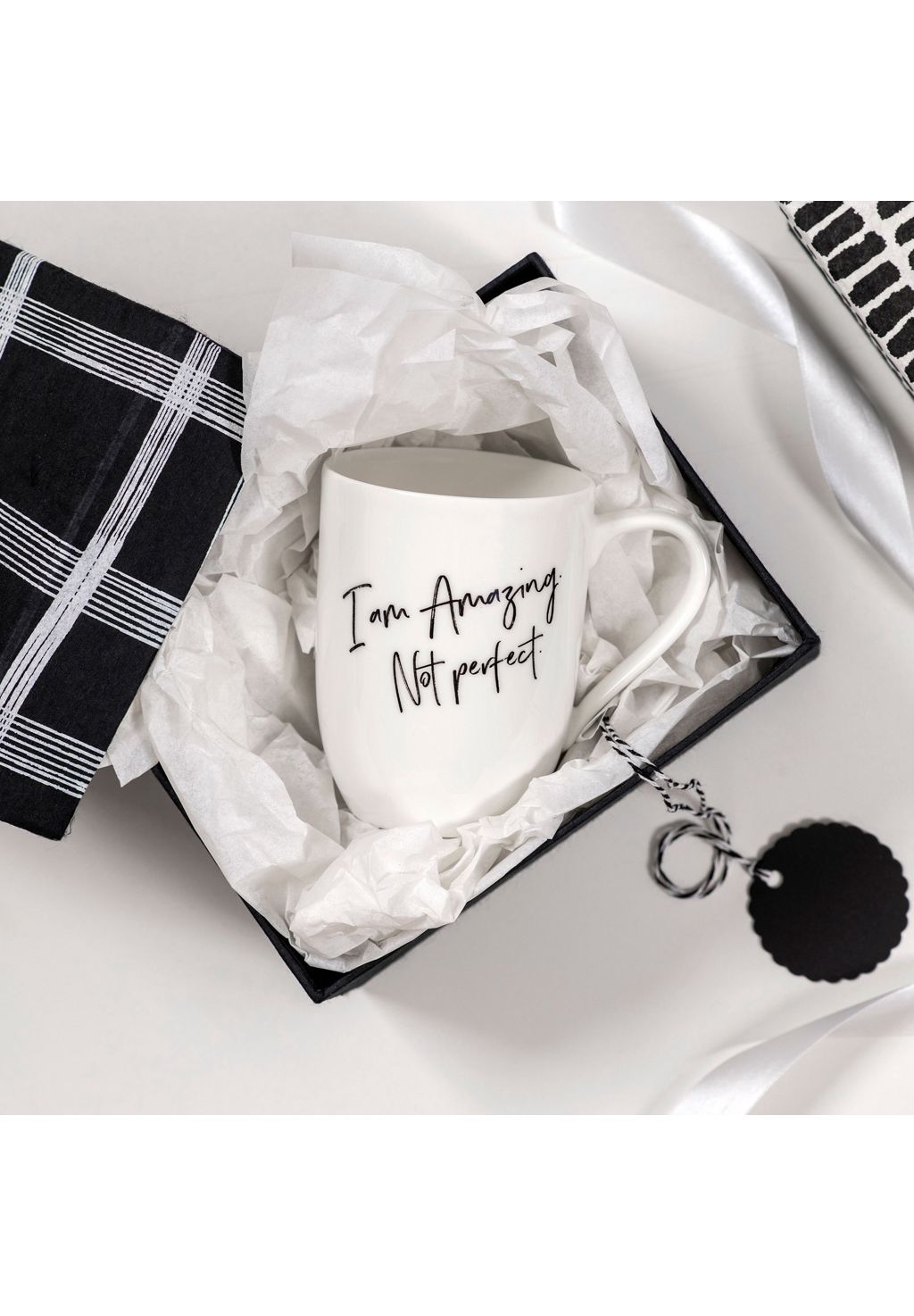 На одной стороне кружки напечатана надпись «Я восхитительна. Не идеальна». Благодаря простому белому фарфору она дополняет многие коллекции и предлагает множество вариантов комбинирования. Легко ухаживать: можно мыть в посудомоечной машине и использовать в микроволновой печи.