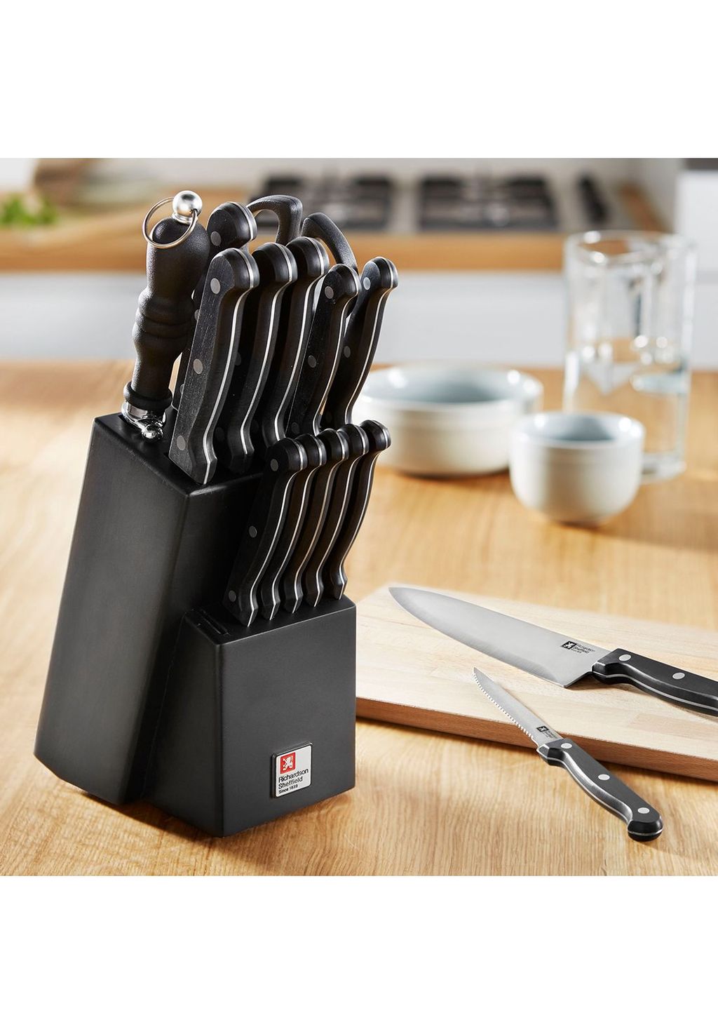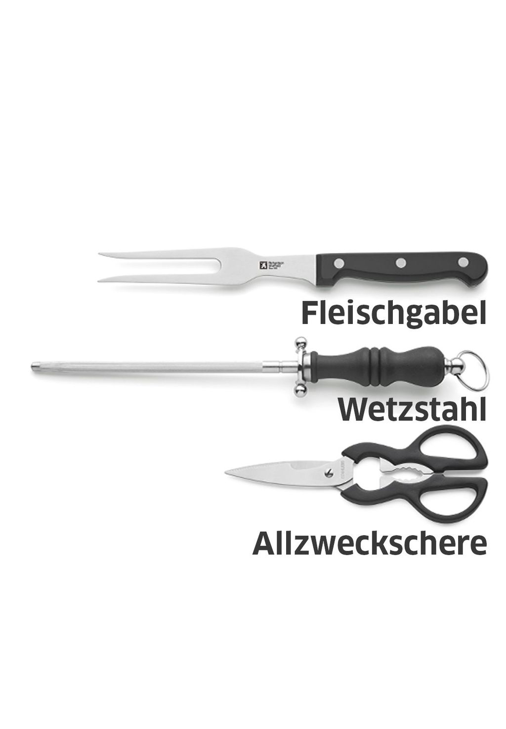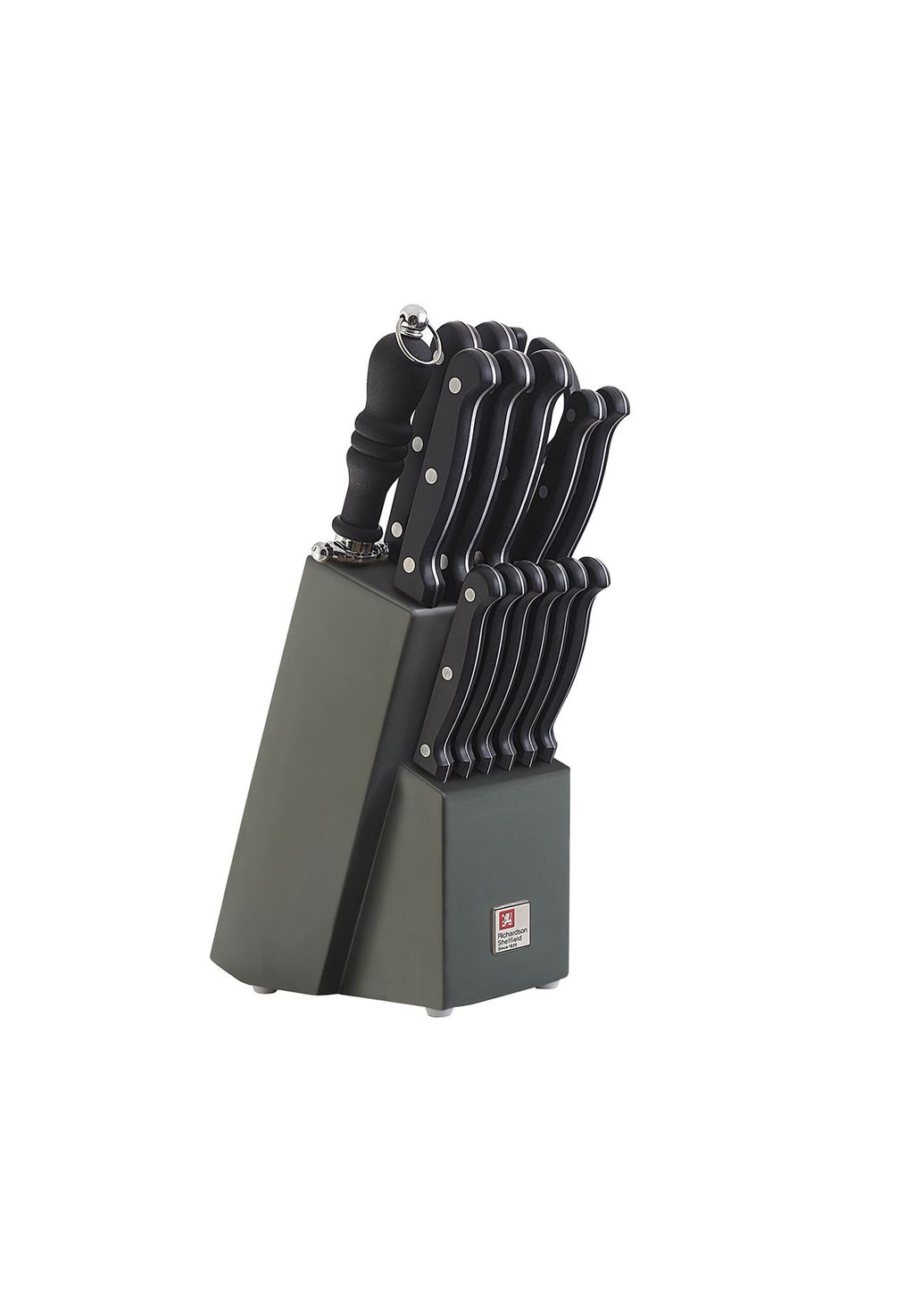 Комплектация: 1 универсальный нож, 1 нож для обвалки мяса, 1 нож для хлеба, 1 поварской нож, 1 ножницы, 1 нож для очистки овощей, 1 вилка для разделки мяса, 1 нож для разделки мяса, 1 мусат, 6 ножей для стейков.