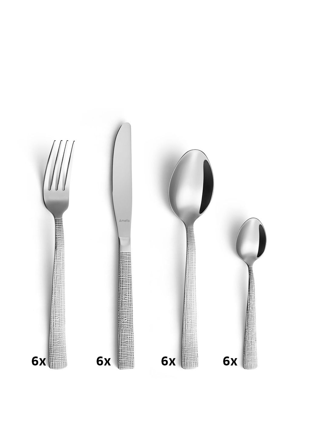 Состав: 6 столовых ножей, 6 столовых вилок, 6 столовых ложек, 6 кофейных ложек