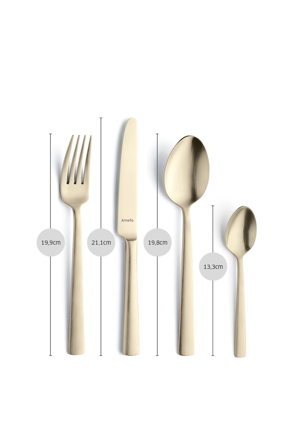 Описание товара: Столовые приборы, которые ненавязчиво привлекают внимание: современный, четкий дизайн в сочетании с актуальной матовой поверхностью цвета шампанского делают VENTURA настоящей приманкой для глаз на любом столе. В стильной коробке для столовых приборов с имитацией дерева.