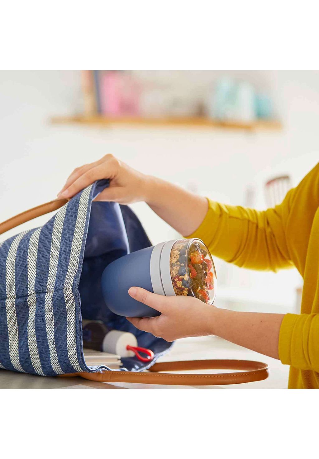 ОБЪЕМ (мини): Нижний контейнер имеет емкость 300 мл и предлагает достаточно места для супа или йогурта. Объем верхней емкости составляет 120 мл, что соответствует примерно 50 г хлопьев или фруктов.