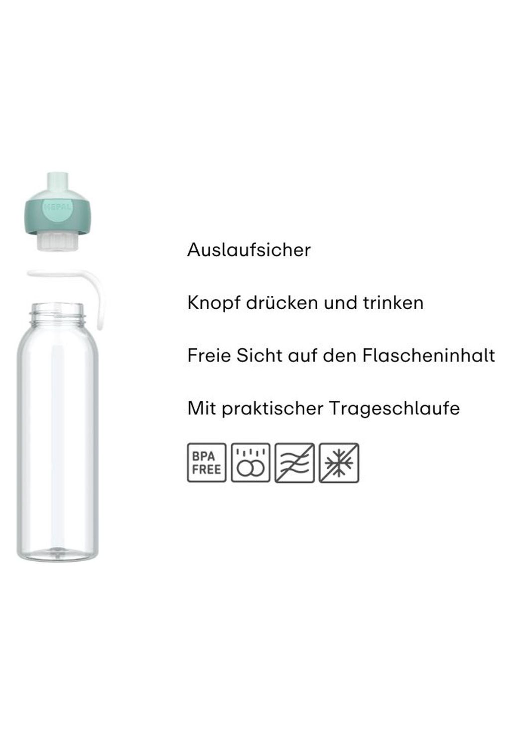 Хотите мотивировать своего ребенка пить больше воды? Эта замечательная бутылка для воды Mepal с функцией Pop-Up значительно упростит задачу! Прозрачная бутылка для питья мотивирует его пить до последней капли: она точно показывает, сколько он выпил, и поощряет его допить. Это способствует более здоровому образу жизни. Прозрачная бутылка для воды имеет практичную систему Pop-Up, с помощью которой даже самые маленькие могут самостоятельно открывать и закрывать бутылку: просто нажмите и пейте! Многоразовая бутылка для питья практична в школе, во время занятий спортом, после уроков плавания и в дороге. Большая емкость 500 мл позволяет легче придерживаться рекомендуемого суточного количества воды. Бутылка для воды оснащена прочной петлей для удобной переноски. Бутылка также очень прочная. Отлично подходит для мамы и папы: бутылку для воды можно мыть в посудомоечной машине после использования.