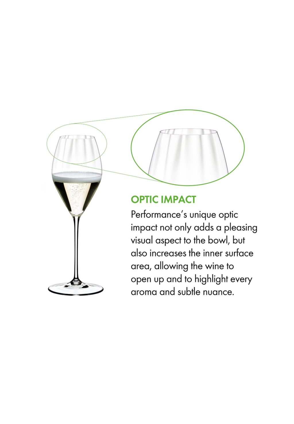 Бокал для шампанского идеально подходит для раскрытия сложных характеристик шампанского. В этом бокале раскрывается широкий спектр ароматов. В отличие от флейты, чаша в форме яйца способствует росту и усилению сложных слоёв шампанского, а более широкий ободок позволяет им высвобождаться, что невозможно в узком бокале. Бокал также имеет «точку шипения», которая способствует образованию пузырьков шампанского. В рамках серии Performance эта форма была переработана в 2018 году. Этот бокал идеально подходит для лёгкого, свежего, сухого шампанского, игристых вин, просекко и игристых вин. Изделие изготовлено из прозрачного хрусталя. RIEDEL Performance — первая в мире серия бокалов для вина, предлагающая бокалы с лёгким оптическим эффектом. Этот эффект также положительно влияет на дегустационные ощущения.