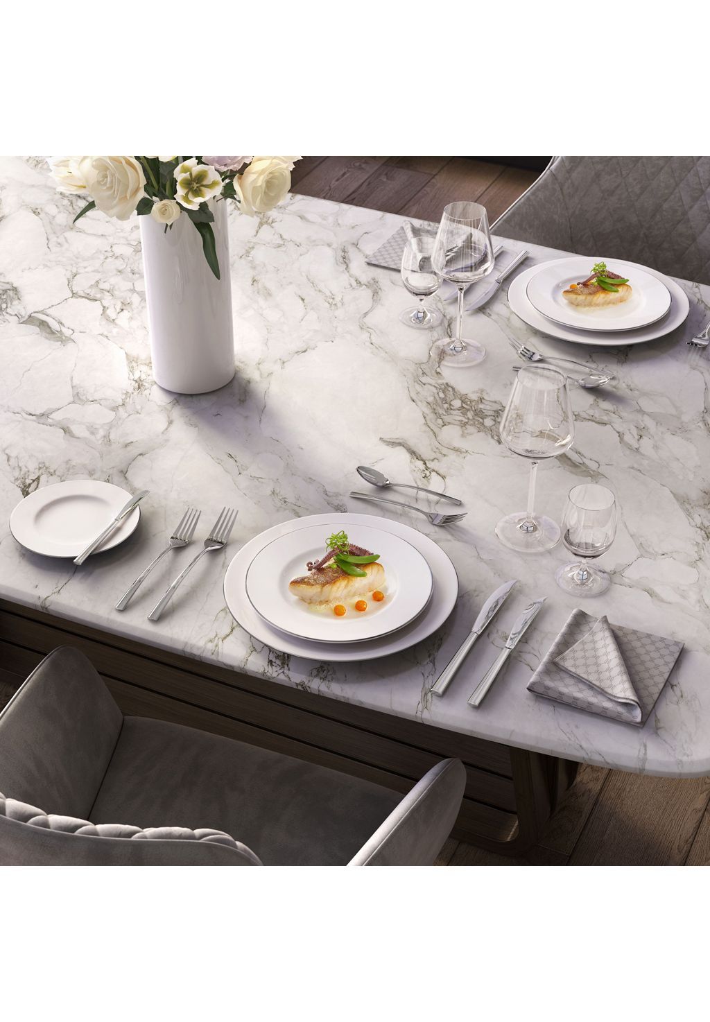 Особенности: Villeroy & Boch предлагает высшую степень элегантности для любого стола: Ослепительно белый цвет и изысканный платиновый декор характеризуют неподвластные времени коллекции Anmut Platinum № 1 и № 2.