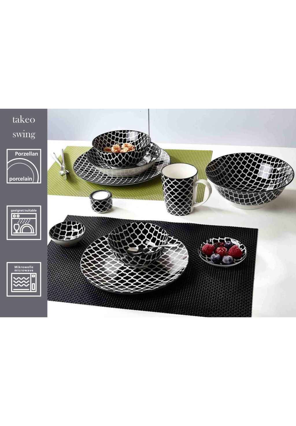 «Takeo» позволяет стильно сочетать и комбинировать типичные азиатские дизайны чаш для риса. Однако, в отличие от своих традиционных аналогов, узоры «Takeo» представлены исключительно в черном цвете, любимом цвете пуристов и минималистов, что придает посуде простой, скандинавский штрих. Особая привлекательность заключается в том, что украшения нанесены на всю поверхность всех предметов посуды, а на некоторых предметах как снаружи, так и внутри, так что красивые орнаменты по-настоящему демонстрируются.