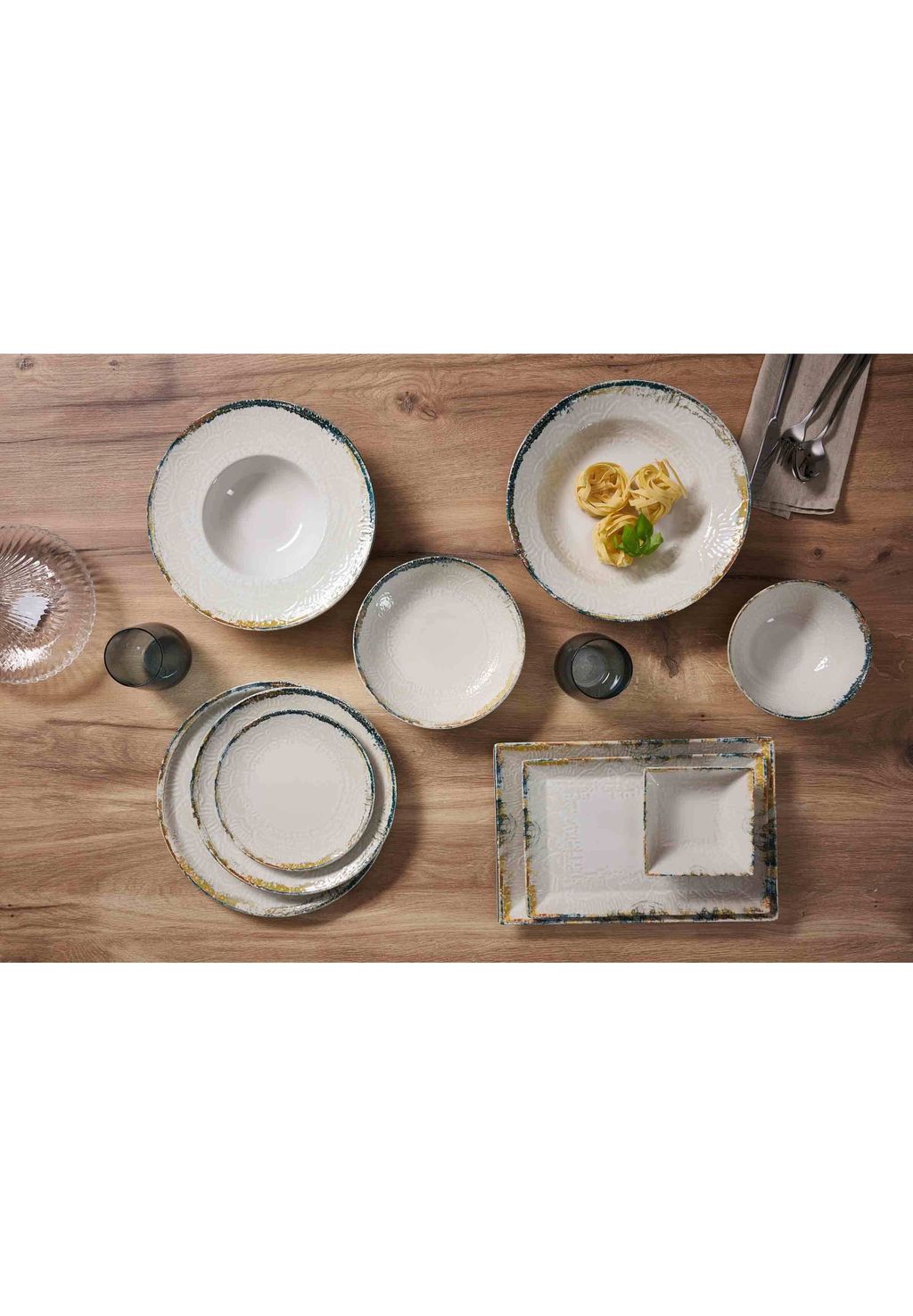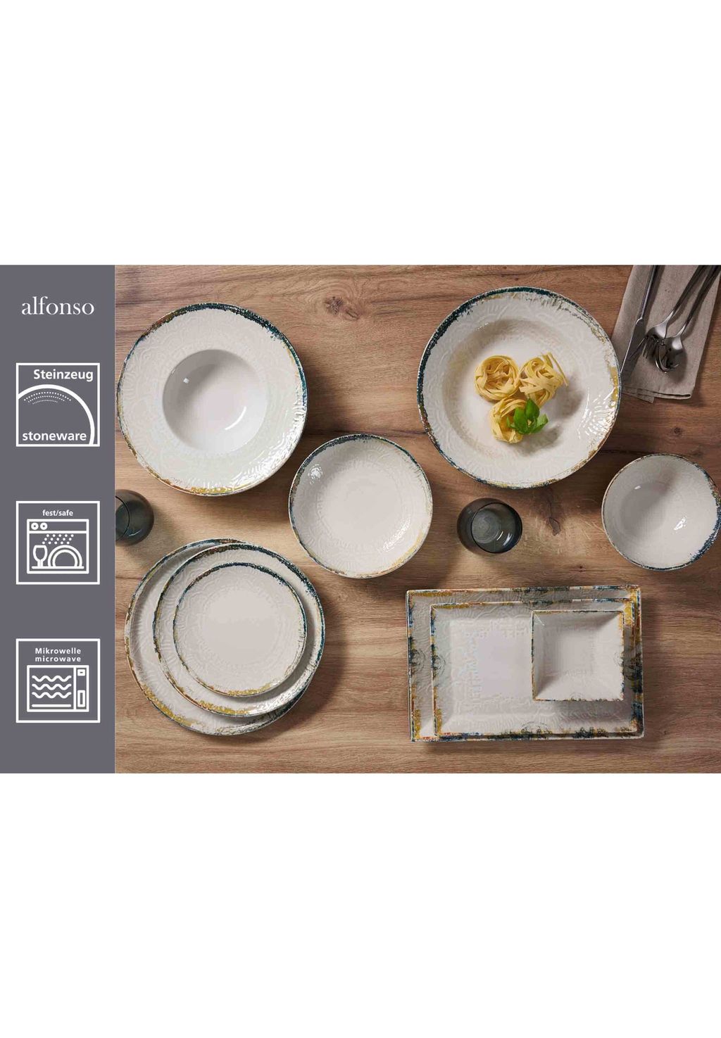 Alfonso переносит нас в Средиземноморье: этот сервировочный и обеденный комплект в средиземноморском стиле обязан своим очаровательным видом ручной работы с мягкими плавными цветовыми переходами и тонким рельефом, словно нанесенным прибоем, особой технике керамической цифровой печати. Декоративные тарелки, блюда и миски задают тон не только испанским тапас, итальянским антипасти и многому другому, греческому мезе, но и кулинарным творениям Востока, например.